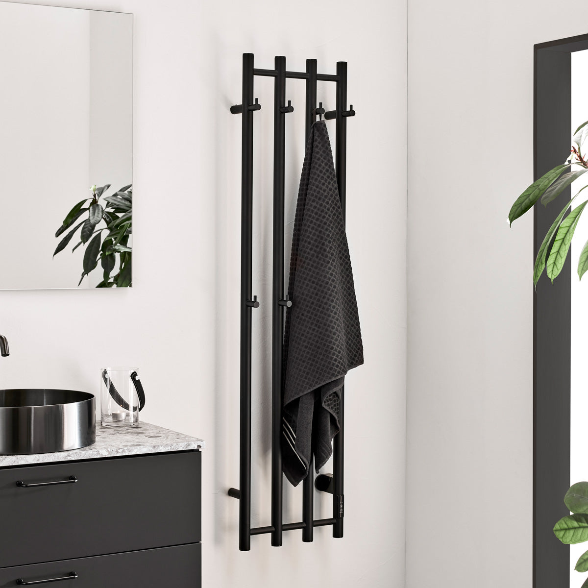 De integrerede kroge giver ekstra plads til flere håndklæder, hvilket gør den ideel til familiebadeværelser eller når du ønsker en rummelig og velorganiseret plads til dine håndklæder. Håndklædetørreren er udstyret med en indbygget timer, hvilket gør det nemt at spare energi ved at slukke for varmen, når den ikke er nødvendig. For et mere stilrent udseende kan Hafa Grace monteres med skjult eltilslutning, og en elektriker kan hjælpe med installationen.