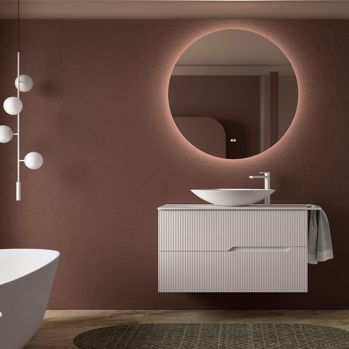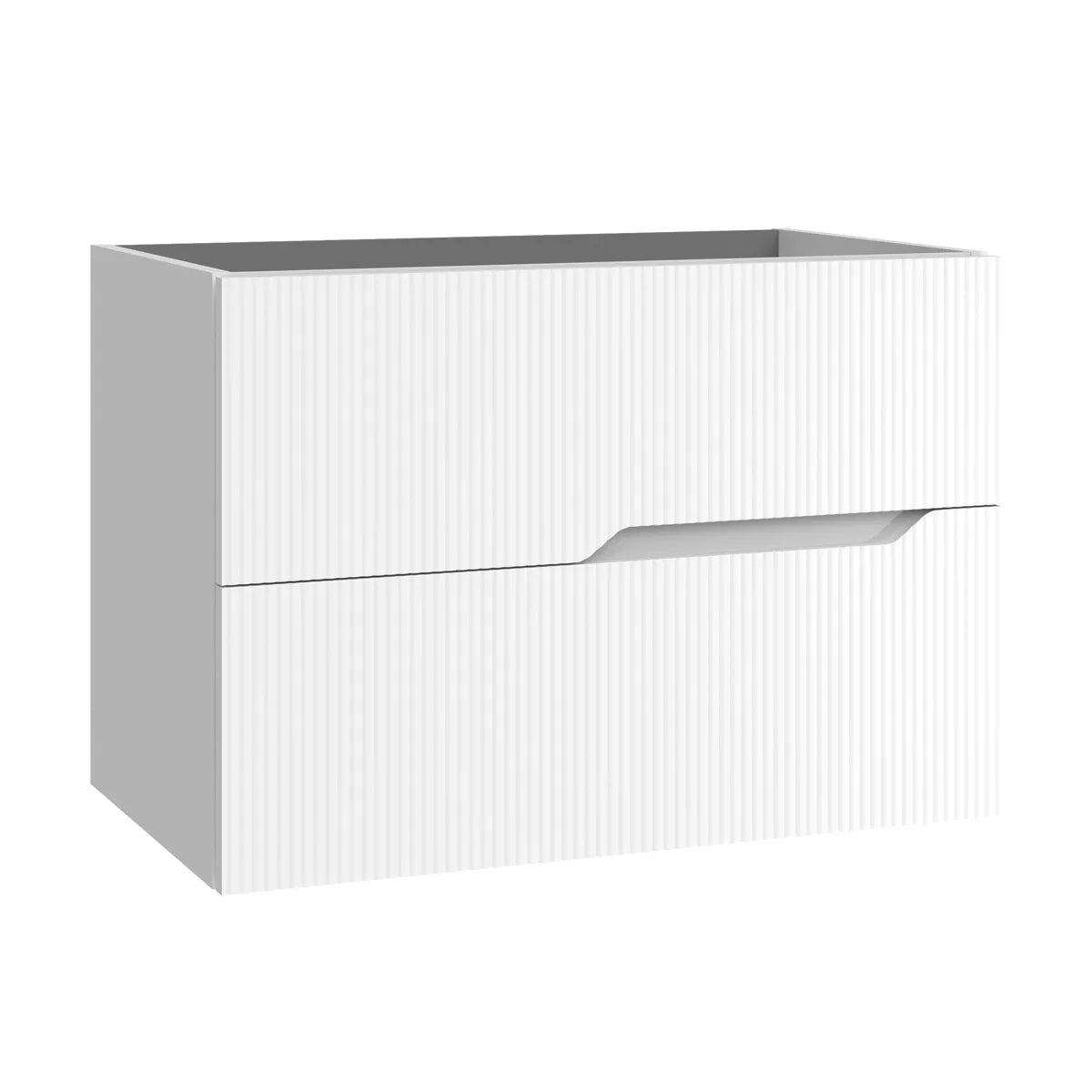 For at give en svævende og minimalistisk følelse har kommoden skjult ophængning, hvilket skaber et rent og afskallet indtryk, hvor gulvpladsen frigøres. Denne designdetalje giver badeværelset et mere luftigt udtryk og gør det desuden nemmere at rengøre under møblet.