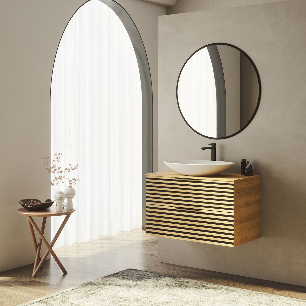 Tenfors Stilja i 80 cm er en moderne badeværelseskommode/vaskeskab i en naturligt lys egetone. Fronten har en markant lamelstruktur: sort MDF-base med horisontale egelameller, som skaber et levende og harmonisk udtryk. To fuldt udtrækkelige skuffer med GRASS-skinner og metalsider giver en blød, lydsvag og kontrolleret lukning, mens praktiske smårum i den øverste skuffe hjælper dig med at holde orden på småting. Den skjulte ophængning kan justeres i højde og dybde, og det sikre ophængningssystem gør monteringen enkel og stabil. Sorte metalgreb bryder med egenes naturlige tone og fremhæver det moderne design.