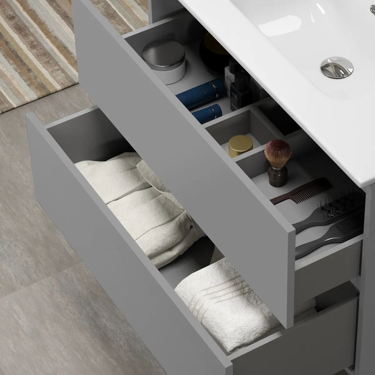 Møblerne i Viken-serien fås i tidløse farver – Hvid Mat, Sort Mat og Grå Mat. Den matte finish giver et sofistikeret og moderne udtryk, samtidig med at overfladen er let at rengøre og vedligeholde. Farverne er nøje udvalgt for at harmonere med forskellige badeværelsesstile og farveskemaer, hvilket gør det nemt at integrere møblerne i din indretning.