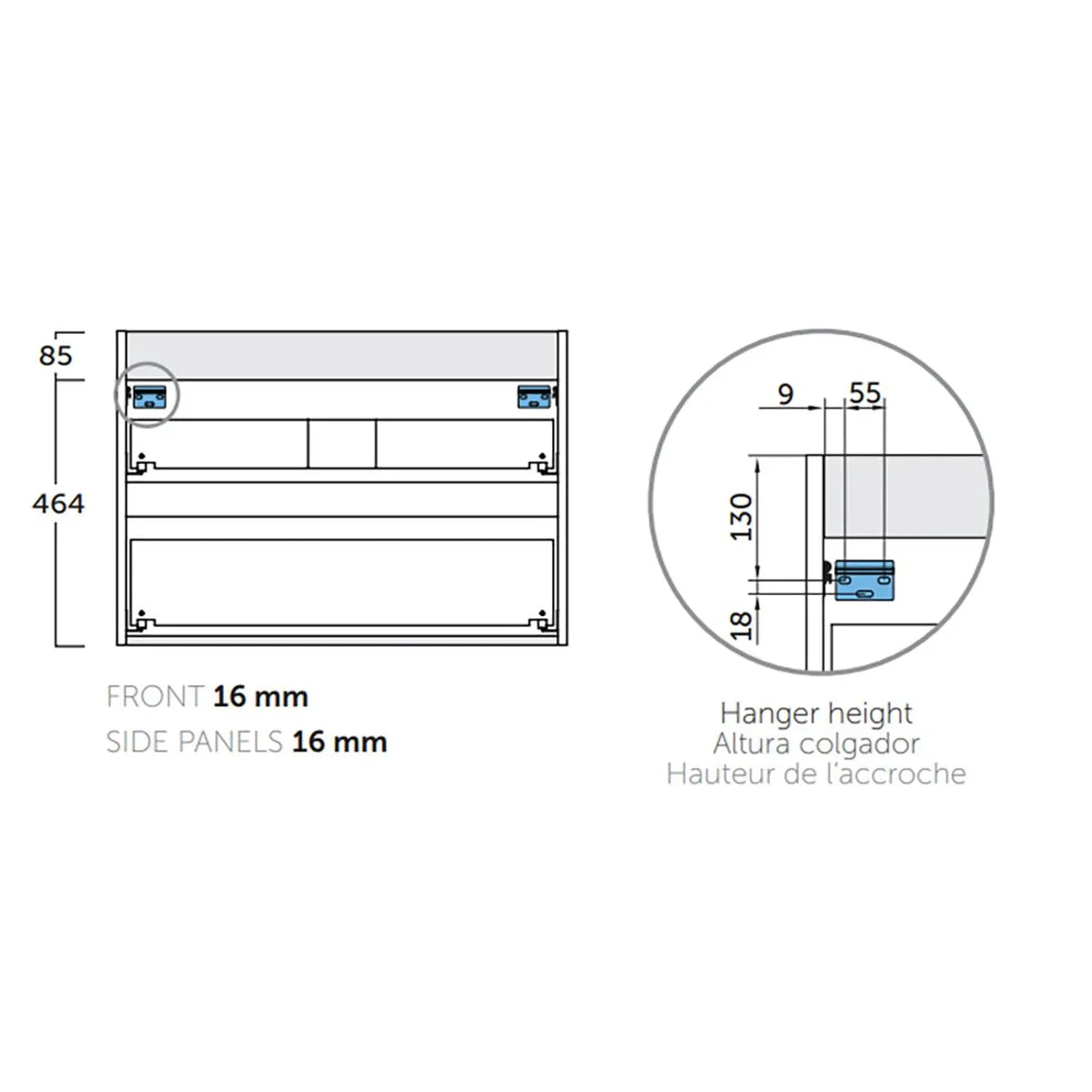 Både kommoder og højskabe i Viken-serien er fremstillet af lamineret MDF, hvilket sikrer en robust og holdbar konstruktion. Den laminerede overflade er modstandsdygtig over for fugt og pletter, hvilket gør møblerne særligt velegnede til badeværelsesmiljøer. Den skjulte ophængning giver møblerne et svævende og luftigt udtryk, som understreger det minimalistiske design.