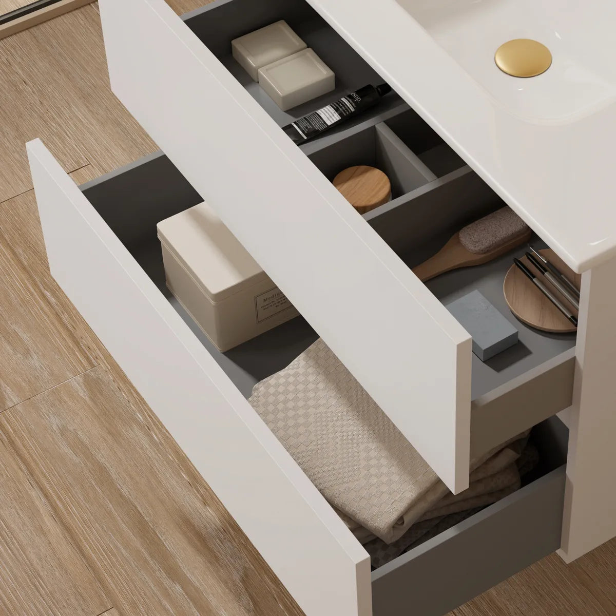 Kommoder og højskabe i serien er udstyret med soft-close mekanismer til skuffer og låger, hvilket både øger brugervenligheden og beskytter møblerne mod unødvendig slitage. Højskabets låger er desuden vendbare, hvilket gør det muligt at tilpasse åbneretningen efter dit badeværelses layout. Glashylder i højskabet giver en elegant og praktisk opbevaringsløsning, mens det grebsløse design skaber et rent og moderne udtryk.