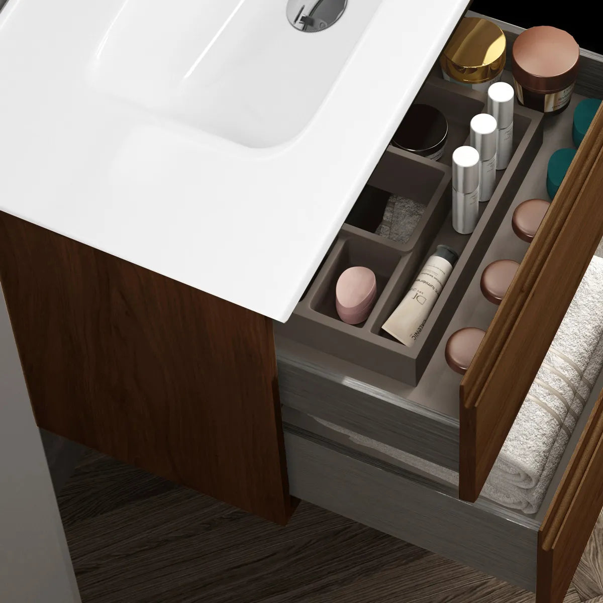 Ved at kombinere kommoder og højskabe fra serien skabes et ensartet og harmonisk badeværelsesmiljø. De subtile detaljer og gennemtænkte funktioner bidrager til en eksklusiv følelse og løfter helhedsindtrykket i rummet. Serien er desuden nem at vedligeholde, med overflader der let rengøres med almindeligt rengøringsmiddel og en blød klud.