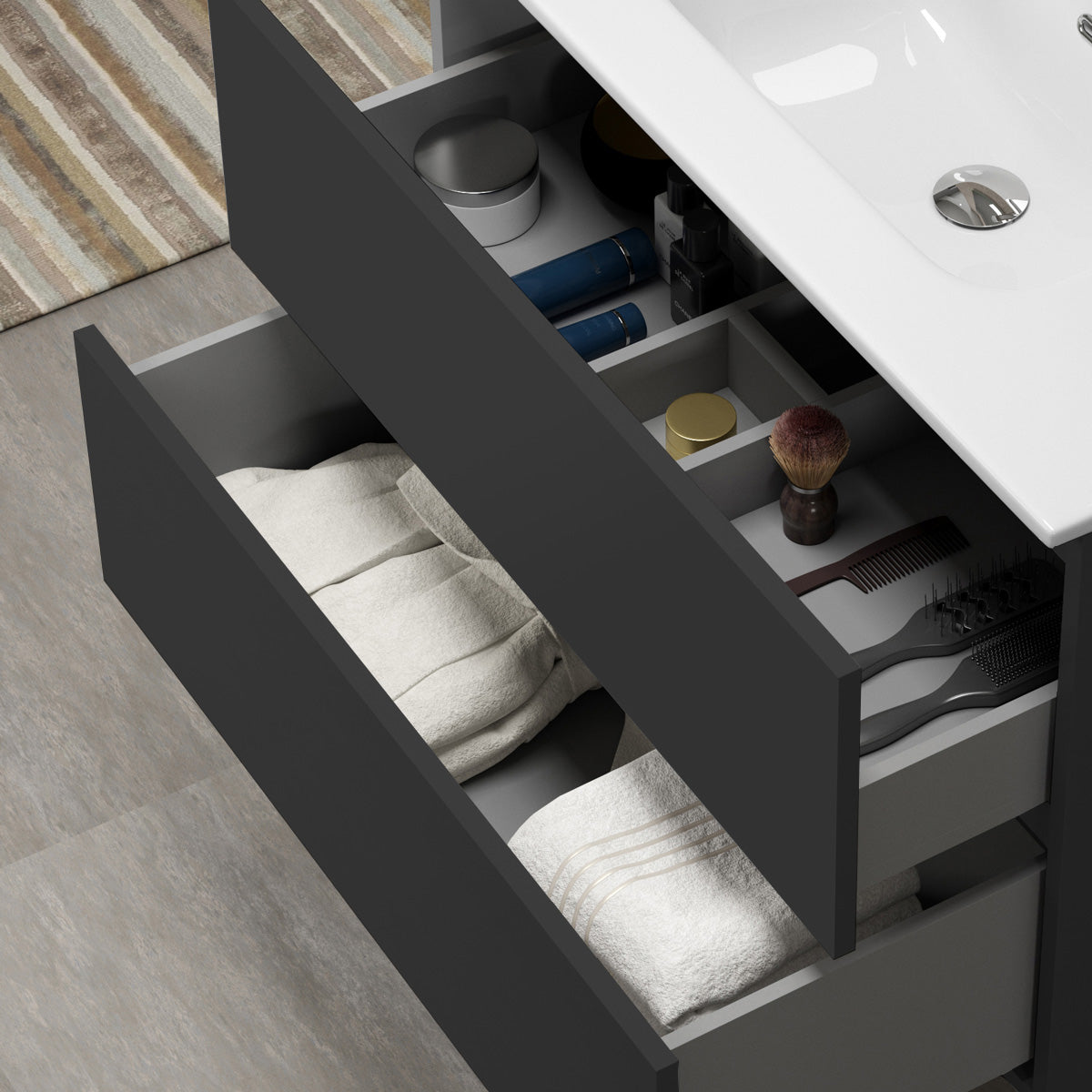 Møblerne i Viken-serien fås i tidløse farver – Hvid Mat, Sort Mat og Grå Mat. Den matte finish giver et sofistikeret og moderne udtryk, samtidig med at overfladen er let at rengøre og vedligeholde. Farverne er nøje udvalgt for at harmonere med forskellige badeværelsesstile og farveskemaer, hvilket gør det nemt at integrere møblerne i din indretning.