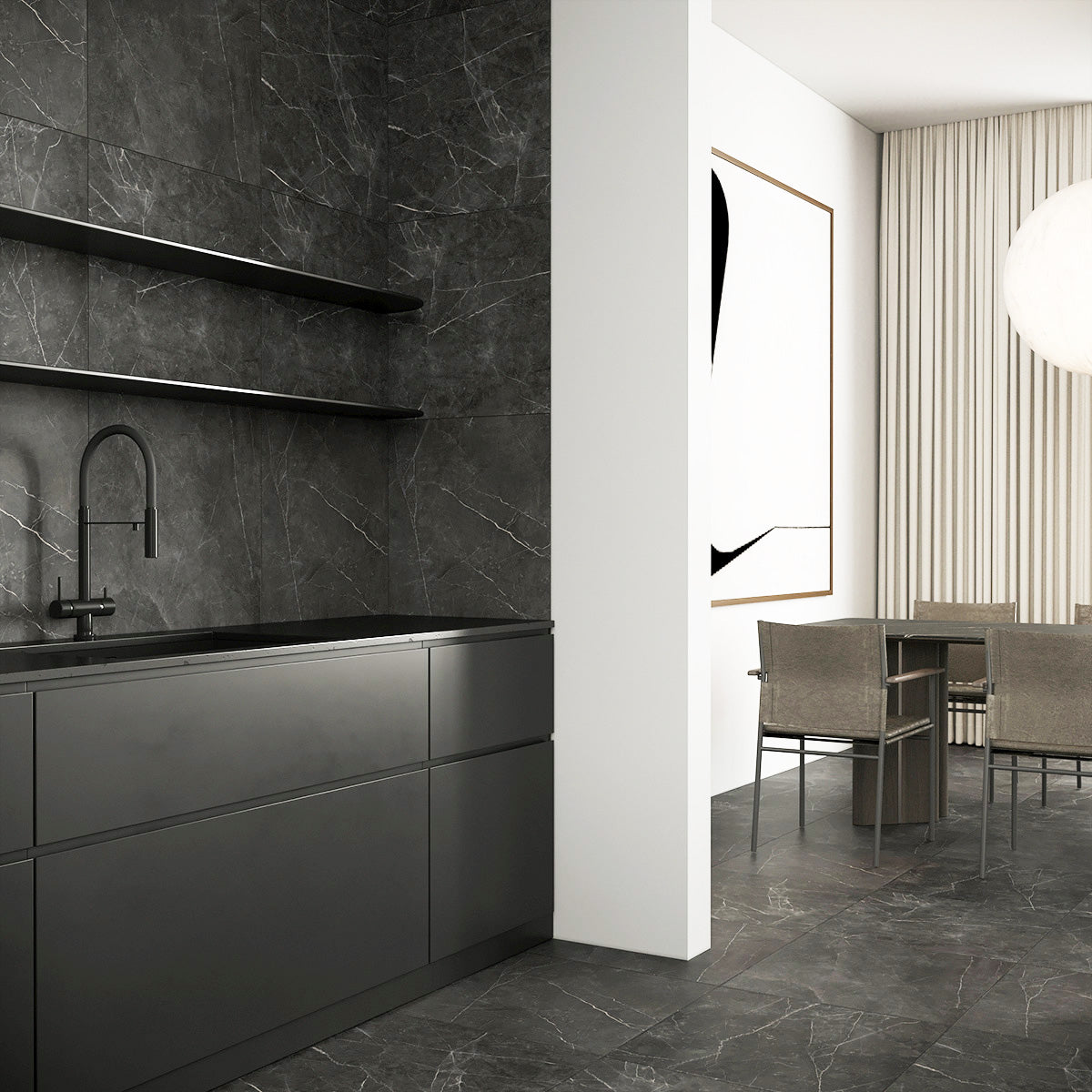Venatto imiterar svart marmor med enastående precision. Den djupa, dramatiska svarta färgen kompletteras av subtila, vita marmoreringar som ger en sofistikerad kontrast. Resultatet är en yta som omedelbart drar blickarna till sig och ger rummet en känsla av exklusivitet och elegans.