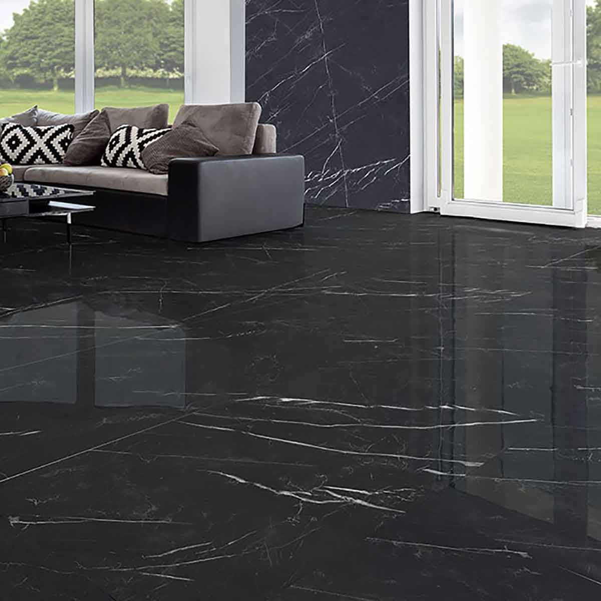 Den højblanke overflade (High Gloss LCP) giver et elegant lysspil og forstærker den dybe sorte tone yderligere. Takket være lige, rektificerede kanter kan fliserne lægges med minimale fuger, hvilket skaber en mere sammenhængende og eksklusiv helhed. Formatet 60x60 cm bidrager til et balanceret og harmonisk udtryk med færre fugelinjer.