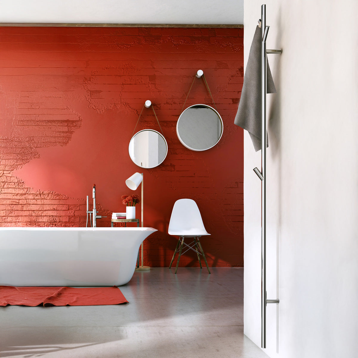Den polerede overflade reflekterer lyset smukt og tilfører en følelse af luksus, mens konstruktionen i rustfrit stål sikrer lang holdbarhed og modstand mod fugt. Den vertikale gulvmodel sparer plads og passer perfekt i både store og små badeværelser. En praktisk og elegant løsning, der også fungerer godt i wellnessrum eller ved badekarret.