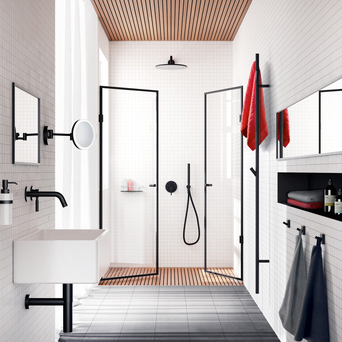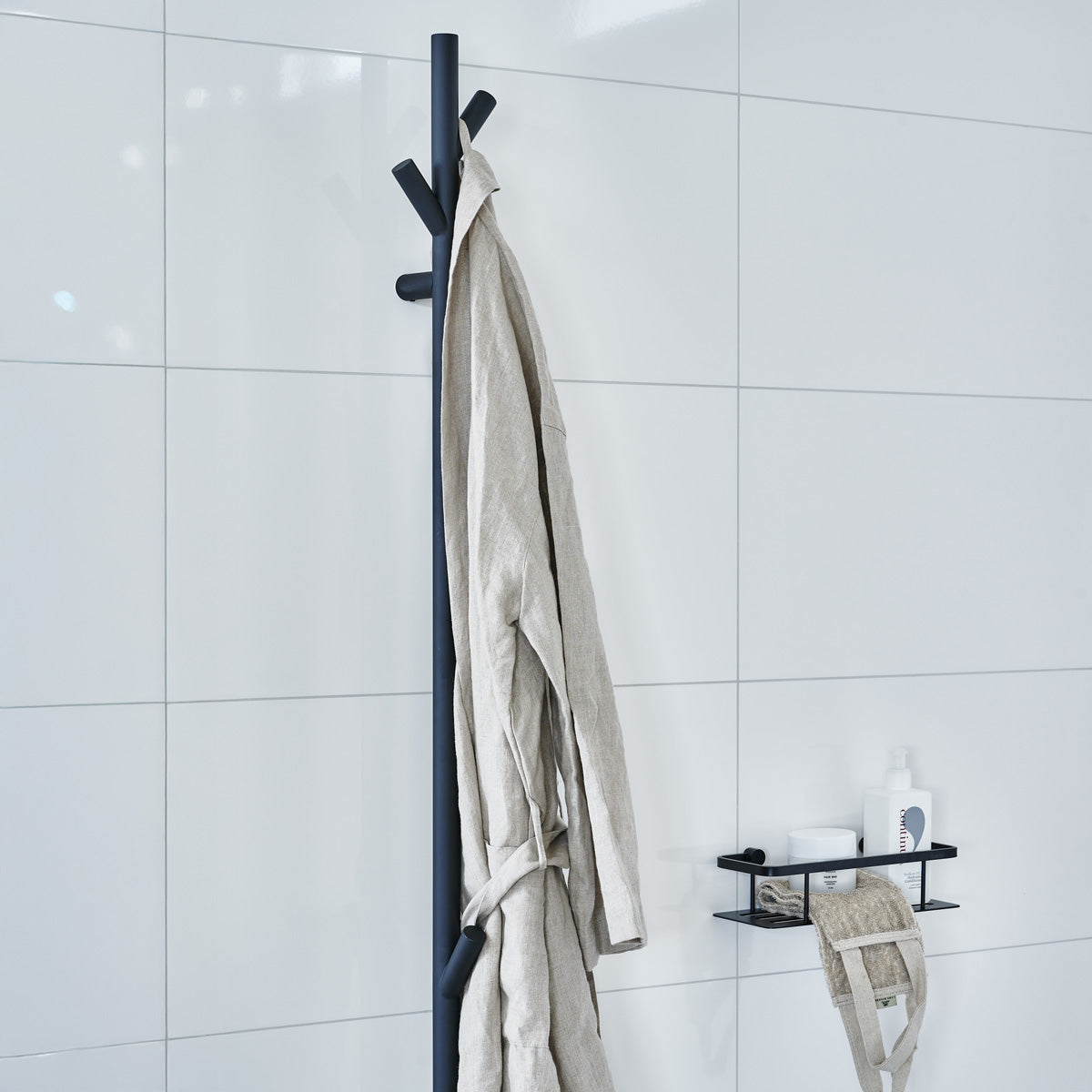 Den matte sorte overflade skaber en elegant kontrast til badeværelsets lyse flader og tilfører et sofistikeret, nutidigt præg. Holderen er fremstillet af rustfrit stål – et slidstærkt og fugtbestandigt materiale, der sikrer lang holdbarhed. Den vertikale gulvmodel sparer plads og passer perfekt både i badeværelset, ved badekarret eller i wellnessområdet.