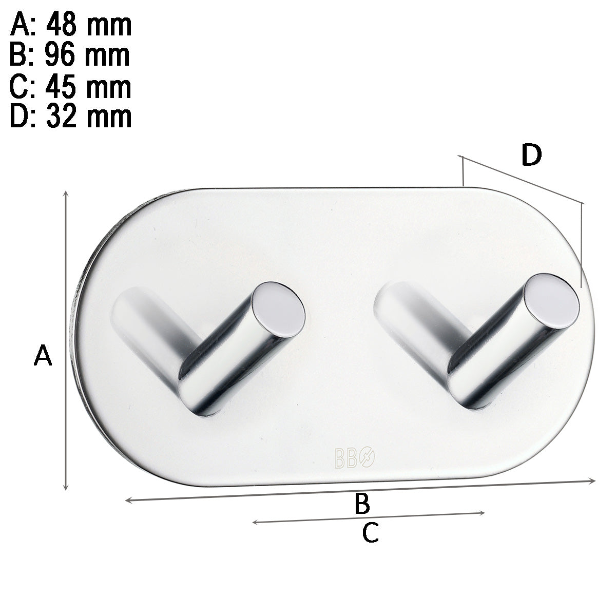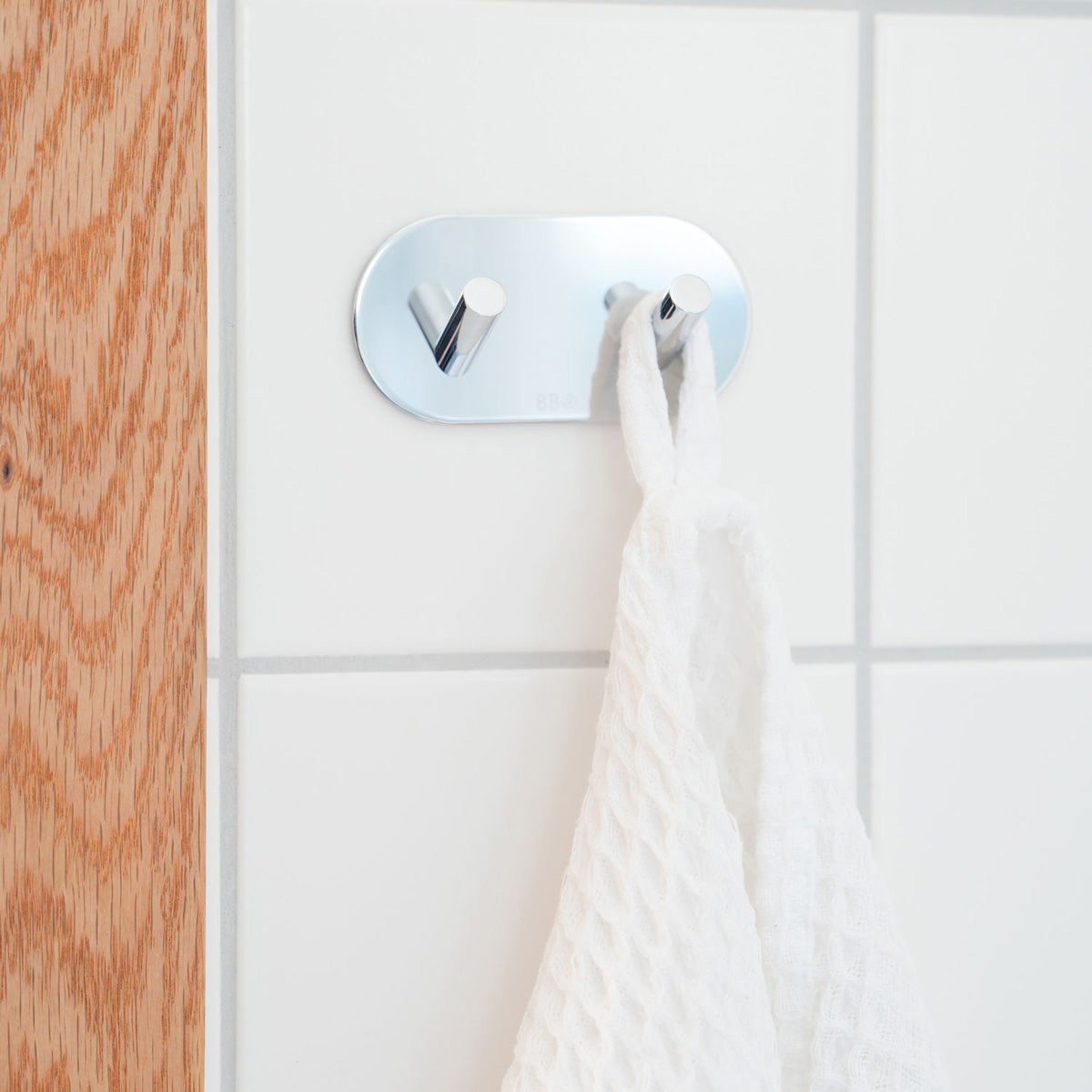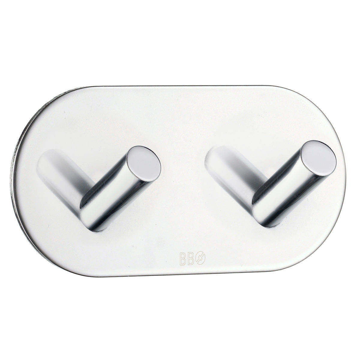En elegant selvklæbende dobbeltkrog i krom, der kombinerer nem montering med holdbar kvalitet – perfekt til et stilrent og funktionelt badeværelse.