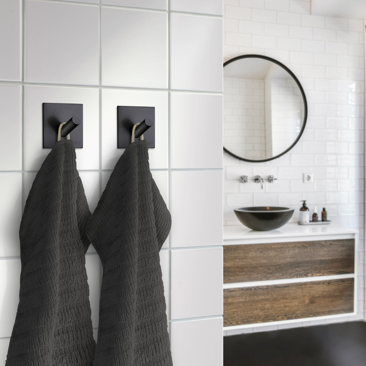 En selvklæbende håndklædekrog i sort mat, der kombinerer nem montering med moderne design og holdbar kvalitet – perfekt til et stilrent og gennemtænkt badeværelse.