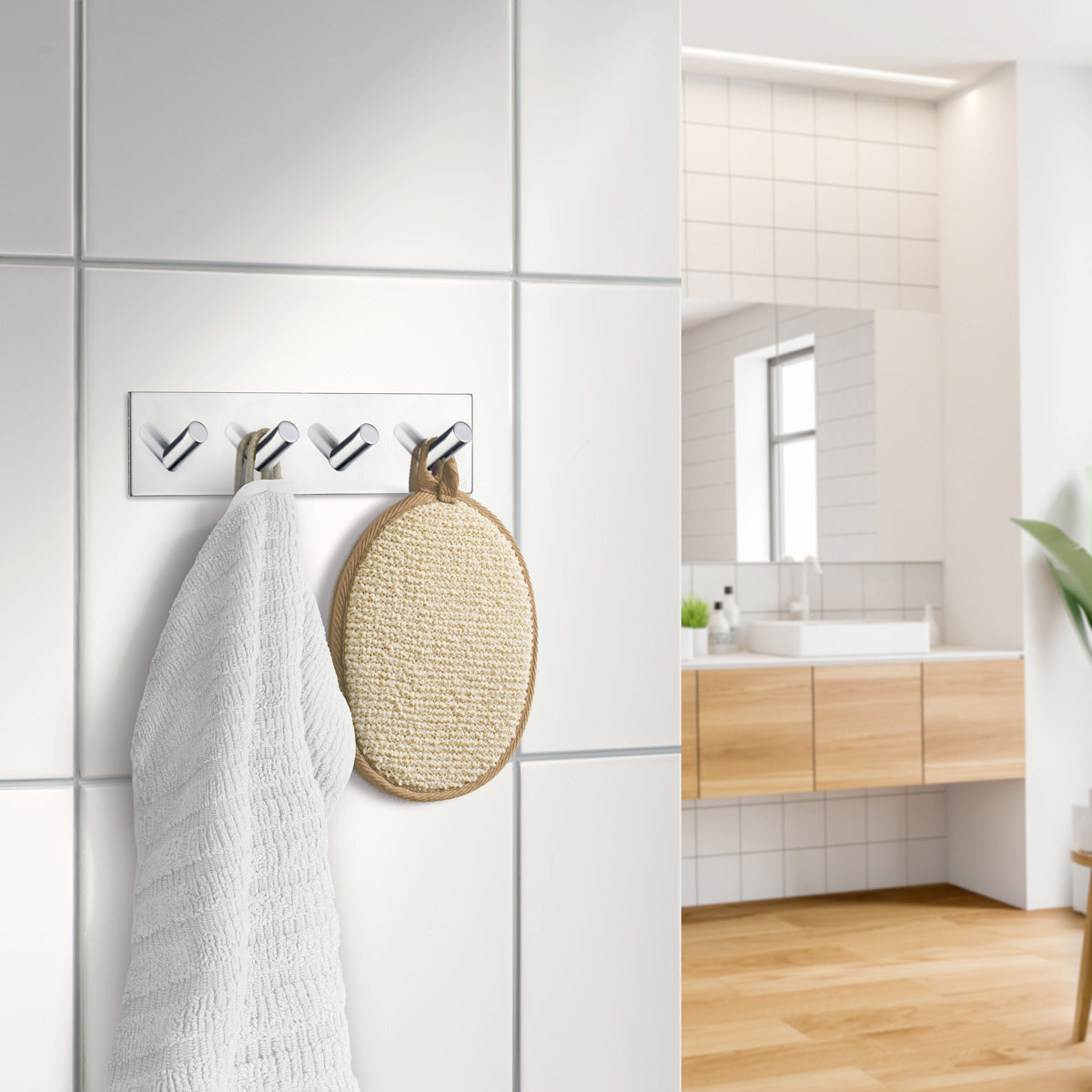 Firekrog Smedbo i blank krom er en moderne og funktionel løsning til dig, der ønsker at holde orden på badeværelset uden at bore i væggene. Den kantede bagplade giver et stilrent og arkitektonisk udtryk, mens den blanke kromoverflade tilfører en elegant glans, der passer perfekt til både klassiske og moderne badeværelser. En praktisk krogskinne, der rummer flere håndklæder, badekåber eller accessories på minimal plads.