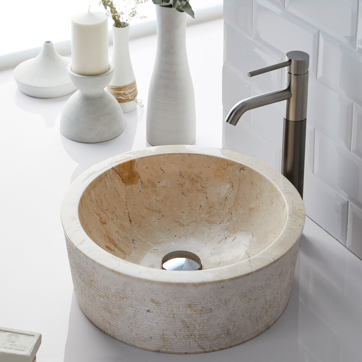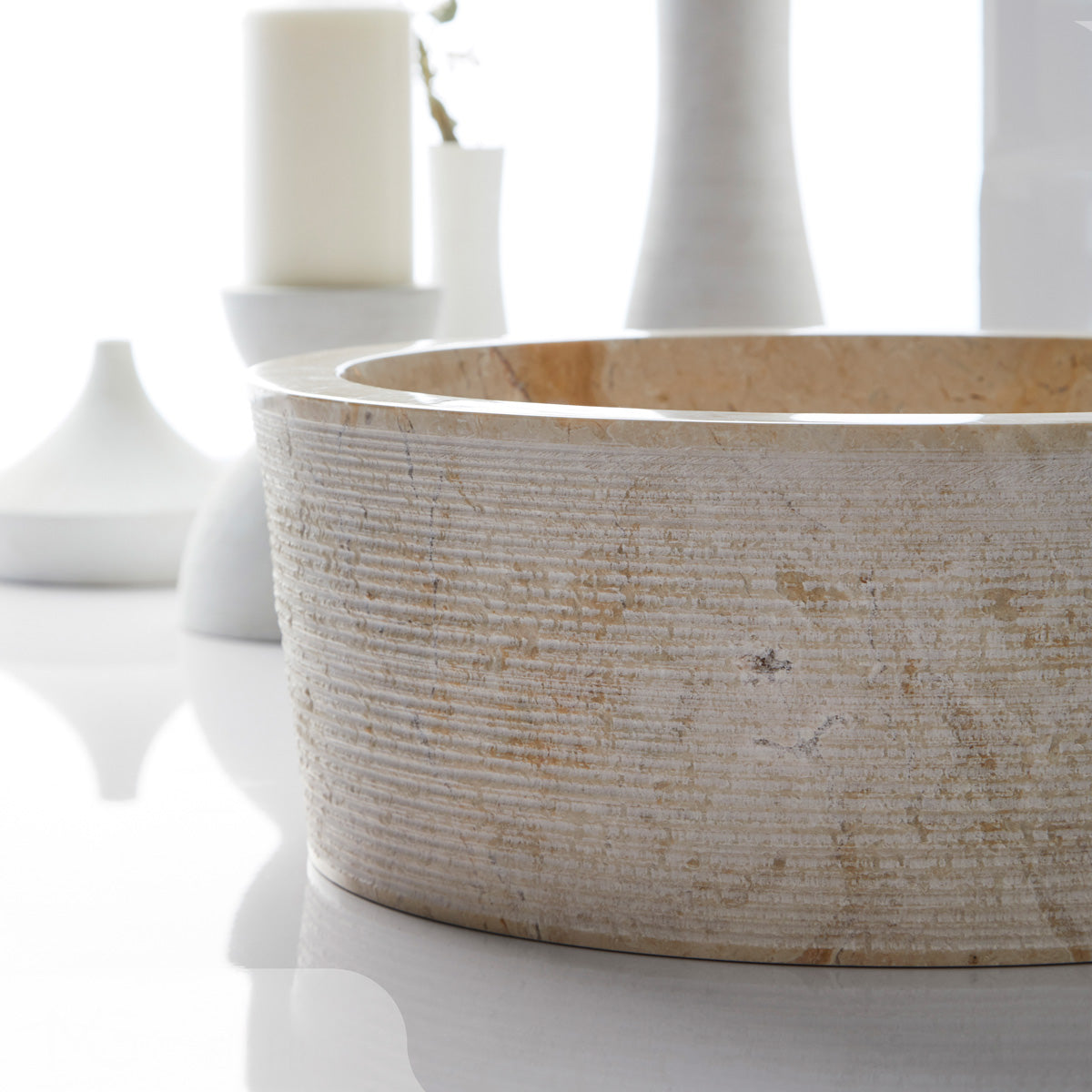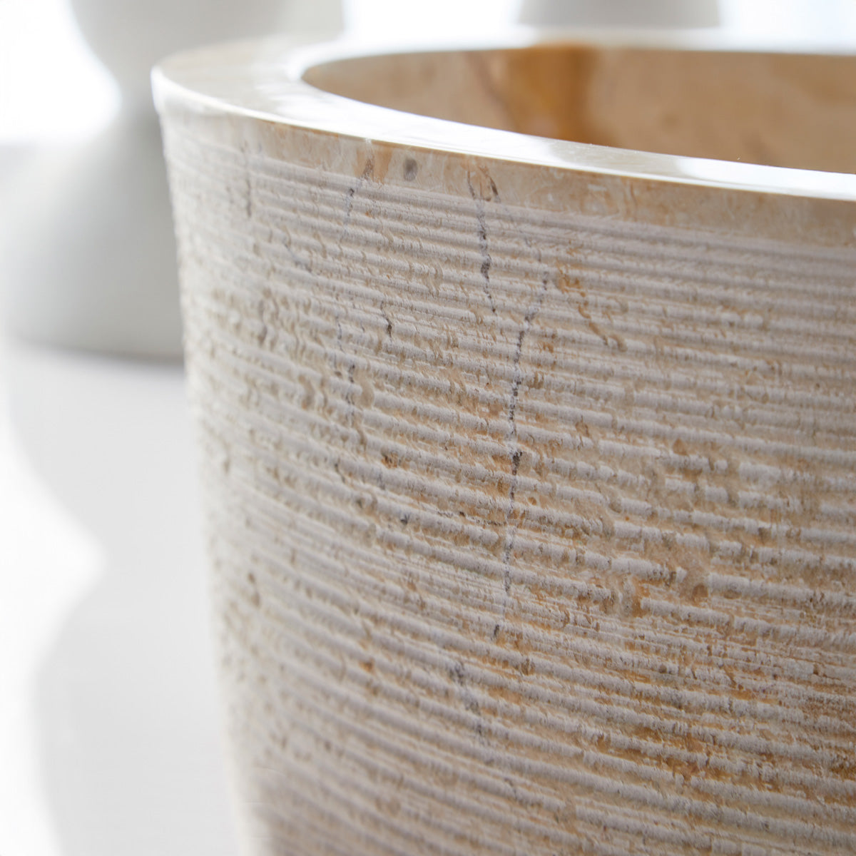 Håndvask Marmor er en elegant og tidløs håndvask fremstillet af ægte natursten, håndbearbejdet med traditionel stenhuggerteknik. Hver håndvask er udskåret af massiv marmor og har identiske mål, men naturlige variationer i farve og årer, som gør hvert eksemplar unikt. Den stribede yderside giver et smukt og taktilt udtryk, mens den glatte, højglanspolerede inderside fremhæver stenens naturlige glans og eksklusive karakter. Et perfekt valg til dig, der ønsker at skabe en harmonisk balance mellem naturlig skønhed og tidløst design på badeværelset.