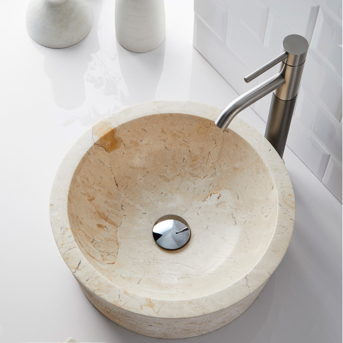 Håndvask Marmor kombinerer eksklusiv marmor med et moderne, minimalistisk design. Den lyse stenoverflade giver et harmonisk udtryk og passer lige godt i klassiske som i moderne badeværelser. Kombinér gerne med et håndvaskbatteri i krom, børstet messing eller sort for at skabe en stilren og balanceret helhed.