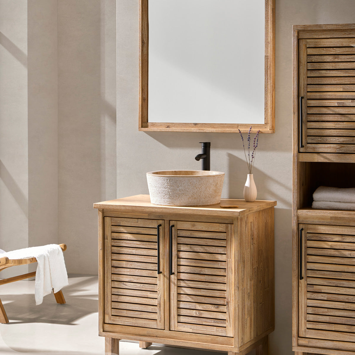 Suppler med en passende bordplade, kommode, håndvaskbatteri, bundventil og vandlås for en komplet løsning.
