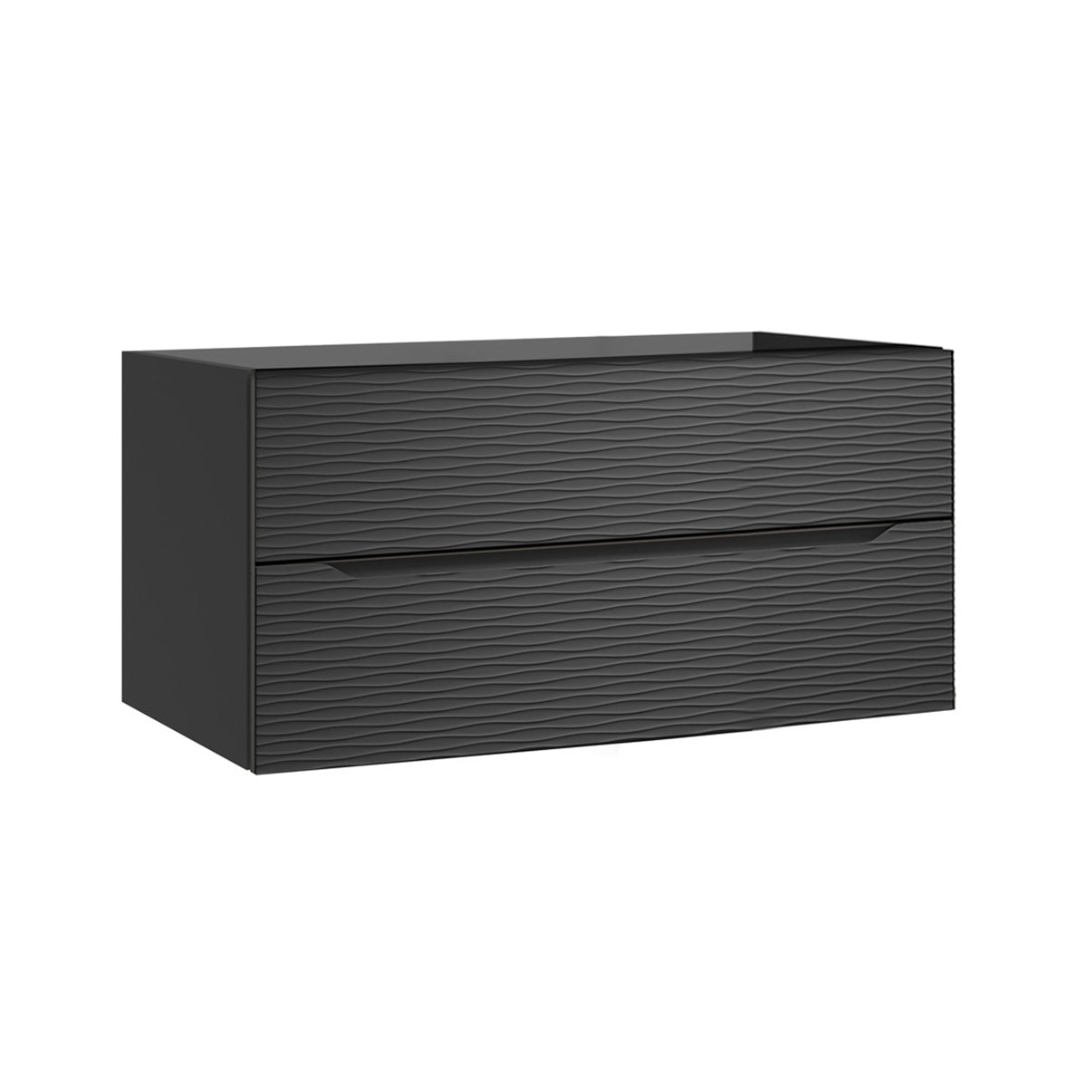 Kommoden Tenfors Sahara i sort mat er en elegant og stilren løsning til dig, der ønsker at tilføje et moderne touch til badeværelset. Denne kommode, med sin unikke bølgeformede struktur kaldet "Dune" på skuffefronterne, skiller sig ud med sit sofistikerede og nutidige design. Fremstillet af lamineret MDF og forstærket med en metalramme er den ikke kun stilfuld, men også robust og holdbar. Kommoden fås i bredderne 60, 80, 100 og 120 cm, har en dybde på 45 cm og en højde på 55 cm, hvilket gør den velegnet til de fleste badeværelser uanset størrelse.