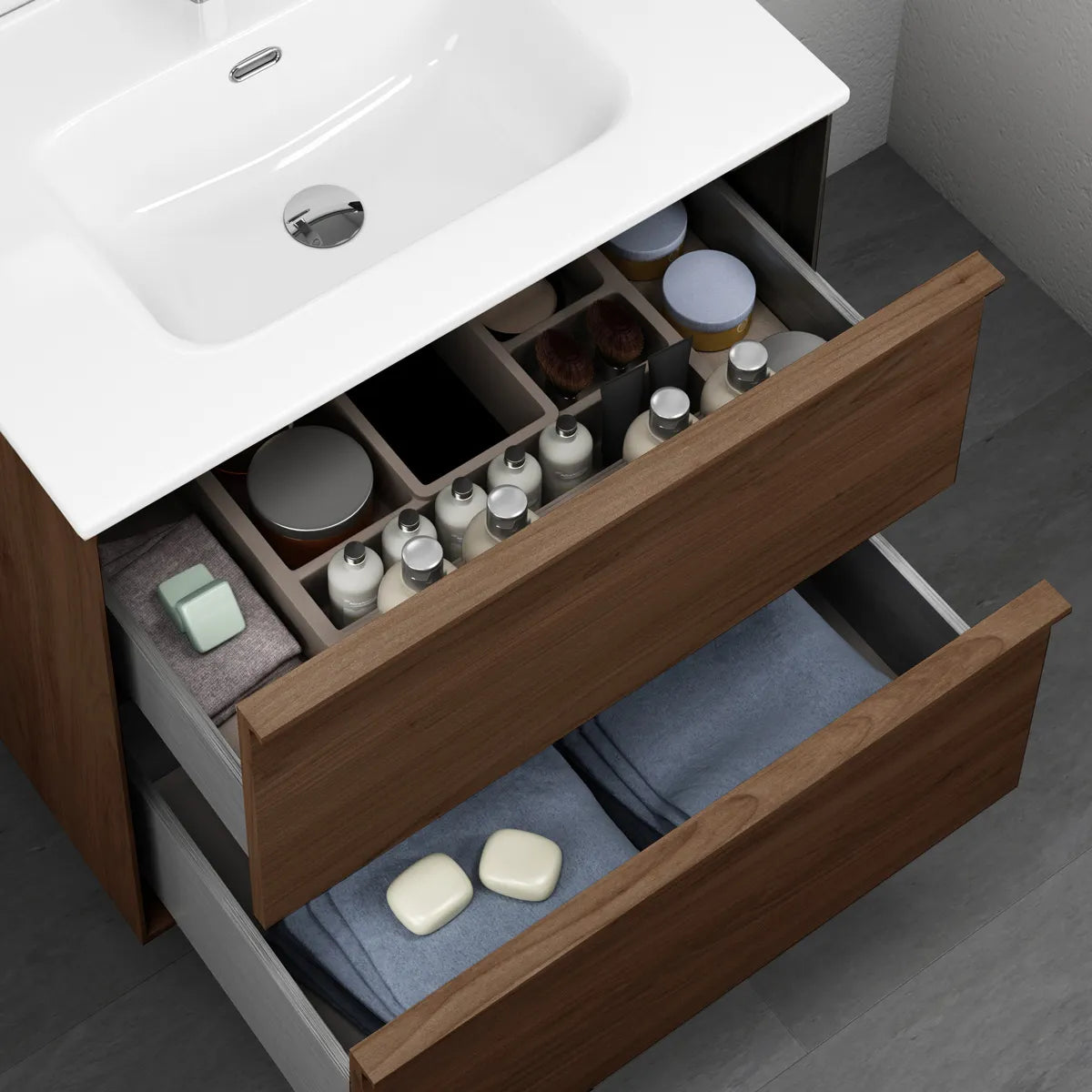 Kommoderne i serien fås i to bredder, 60 cm og 80 cm, hvilket giver fleksibilitet til forskellige badeværelsesstørrelser. Med en dybde på 46 cm og en højde på 59 cm tilbyder de rigelig opbevaringsplads uden at dominere rummet. De er udstyret med to rummelige skuffer med soft-close mekanismer, hvilket gør dem både praktiske og støjsvage. Skuffernes grebskanter, fremstillet i samme materiale og finish som resten af møblet, bidrager til et ensartet og moderne udseende.