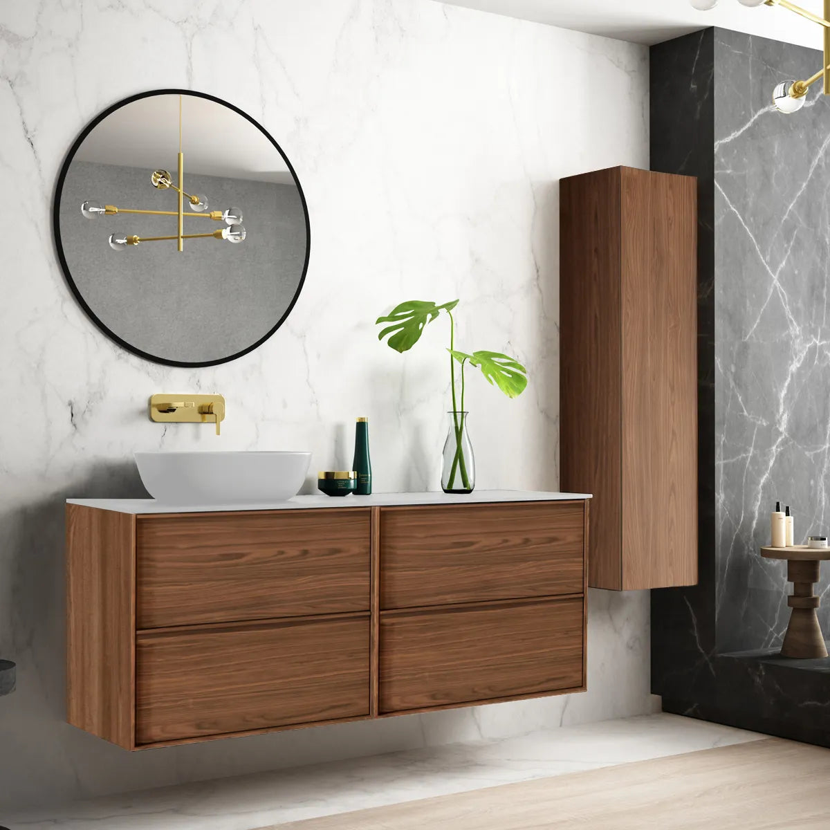 Uanset om du vælger en lys og naturlig egetræsfinish, glat lakeret overflade eller en mørkere og sofistikeret valnødsfinish, tilbyder Tenfors Nordlig en perfekt balance mellem praktiske løsninger og stilrent design. Serien er ideel for dig, der søger en elegant og gennemtænkt møbelserie, der løfter dit badeværelse til nye niveauer af funktionalitet og æstetik.