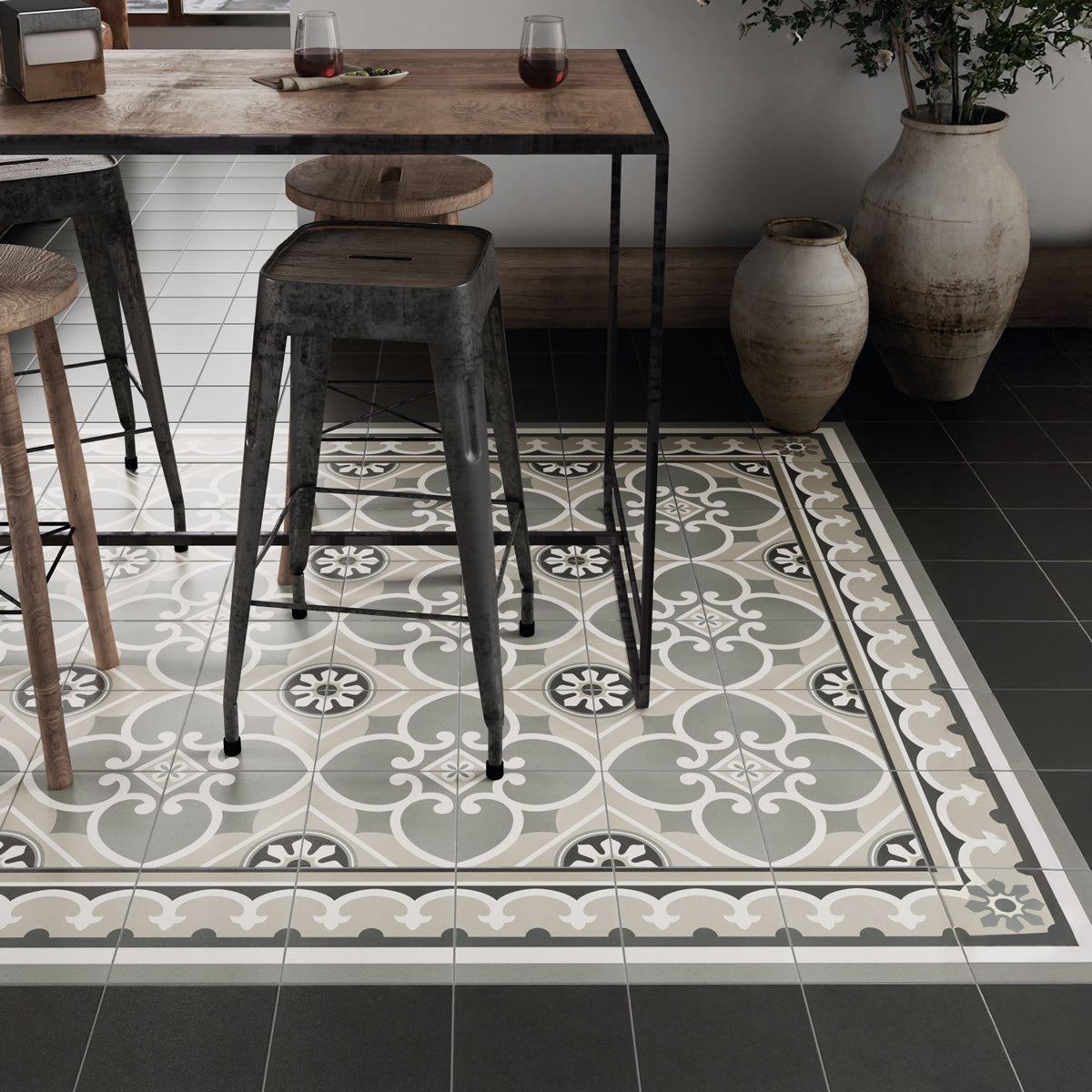 Billederne viser eksempler på, hvordan dekor-, kant- og hjørnefliser kan kombineres for at danne en helhed. Serien giver dig stor fleksibilitet til at tilpasse mønstret efter rummets størrelse og karakter – fra små områder til store gulvflader, hvor designet virkelig kommer til sin ret. Med Atelier får du et både praktisk og æstetisk gulv, der holder i mange år fremover – perfekt til dig, der ønsker at skabe en fornemmelse af århundredeskifte i hjemmet.