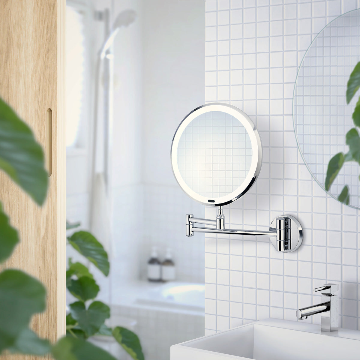 Spejlet er fremstillet i rustfrit stål med en blank, forkromet overflade, der reflekterer lyset smukt og giver badeværelset et stilrent og tidløst udtryk. Den dobbelte, ledede arm gør det nemt at justere spejlet efter behov og folde det ind mod væggen, når det ikke er i brug. Spejlet er batteridrevet med genopladeligt batteri, der oplades via USB – en elegant og kabelfri løsning.