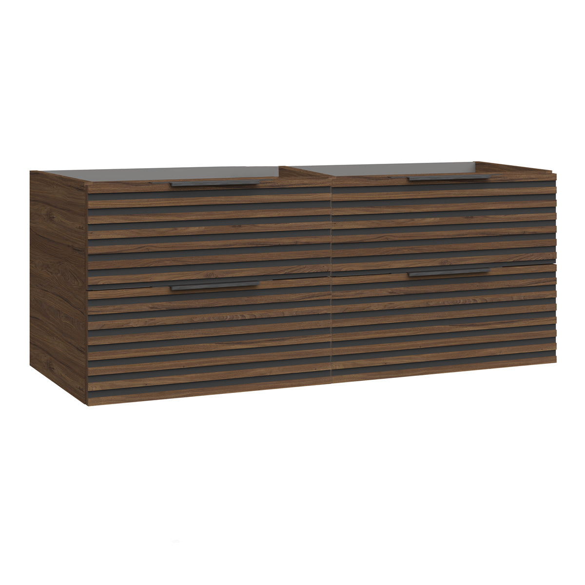 Tenfors Stilja i 120 cm er en rummelig pakkeløsning bestående af to 60 cm kommoder i en varm valnøddetone. Kombinationen giver et bredt og funktionelt badeværelsesmøbel med masser af opbevaringsplads. Fronten har den samme karakteristiske lamelstruktur, der kendetegner Stilja-serien: sort MDF-base med horisontale lameller i valnød, som tilfører designet dybde og rytme. Hver kommode har to fuldt udtrækkelige skuffer med GRASS-skinner og metalsider for blød og lydsvag lukning. I den øverste skuffe findes små rum til praktisk organisering. Ophængningen er skjult, højde- og dybdejusterbar, og monteringen bliver enkel og sikker takket være anti-løsningssystemet. Sorte metalgreb forstærker møblets moderne karakter og skaber en smuk kontrast til valnødens naturlige tone.