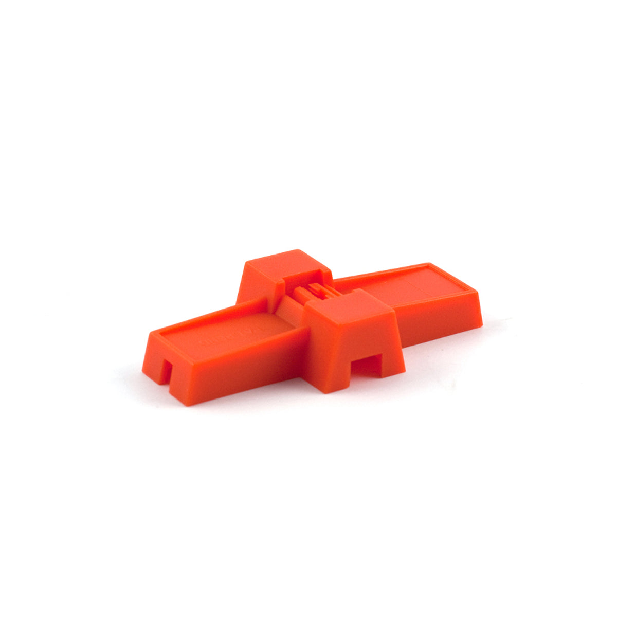 Nivelleringshætteen sættes på nivelleringsbåndene og spændes med monteringspistolen, indtil fliserne ligger på niveau med hinanden. Kan genbruges.