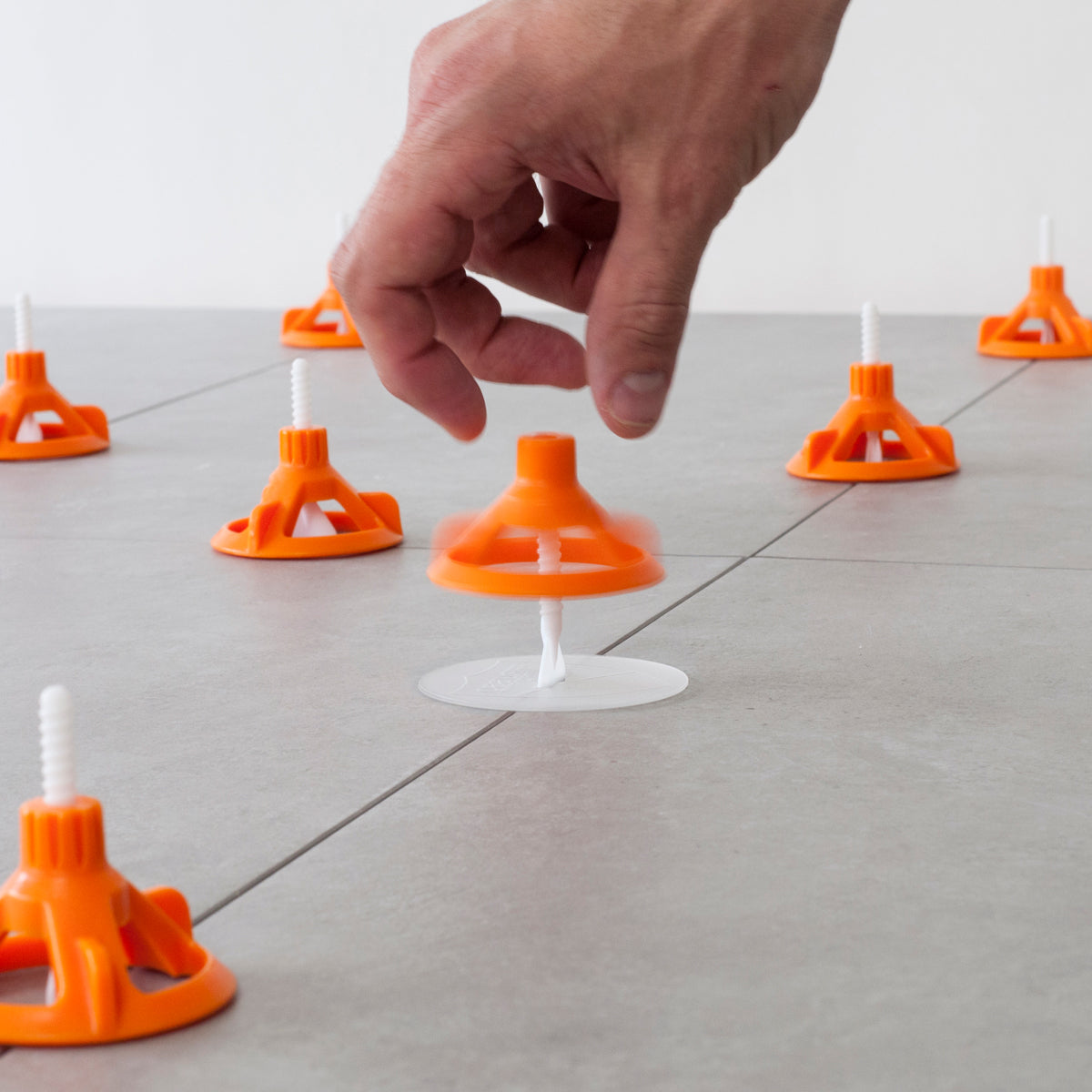 Nivelleringssystemet Spin Level modvirker forskydning i fugerne ved montering af store fliser. Med en patenteret konstruktion, der gør, at nivelleringshætten automatisk skrues ned på nivelleringsskruen med minimal anstrengelse, er det muligt kun med én hånd at stramme og justere nivelleringshætten.