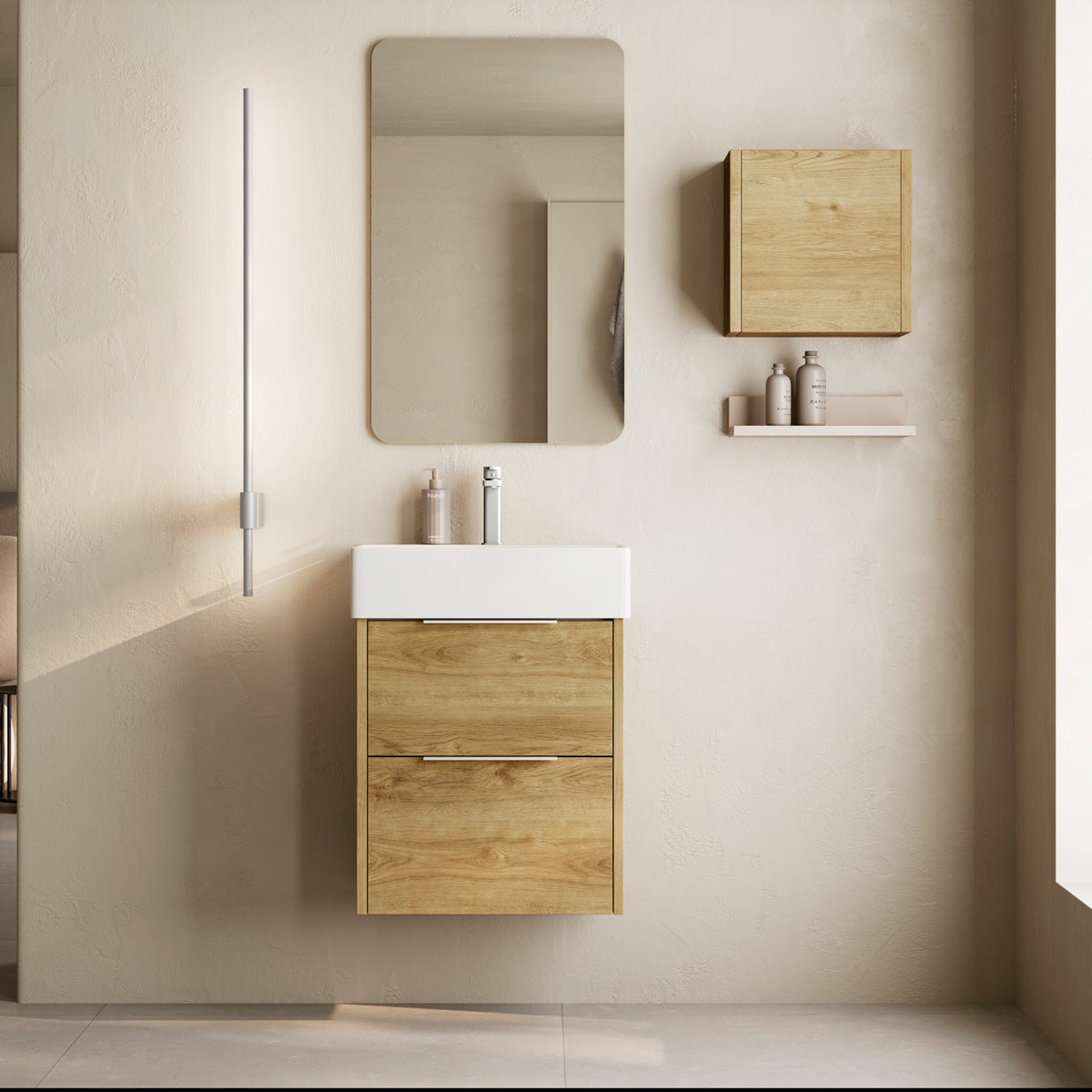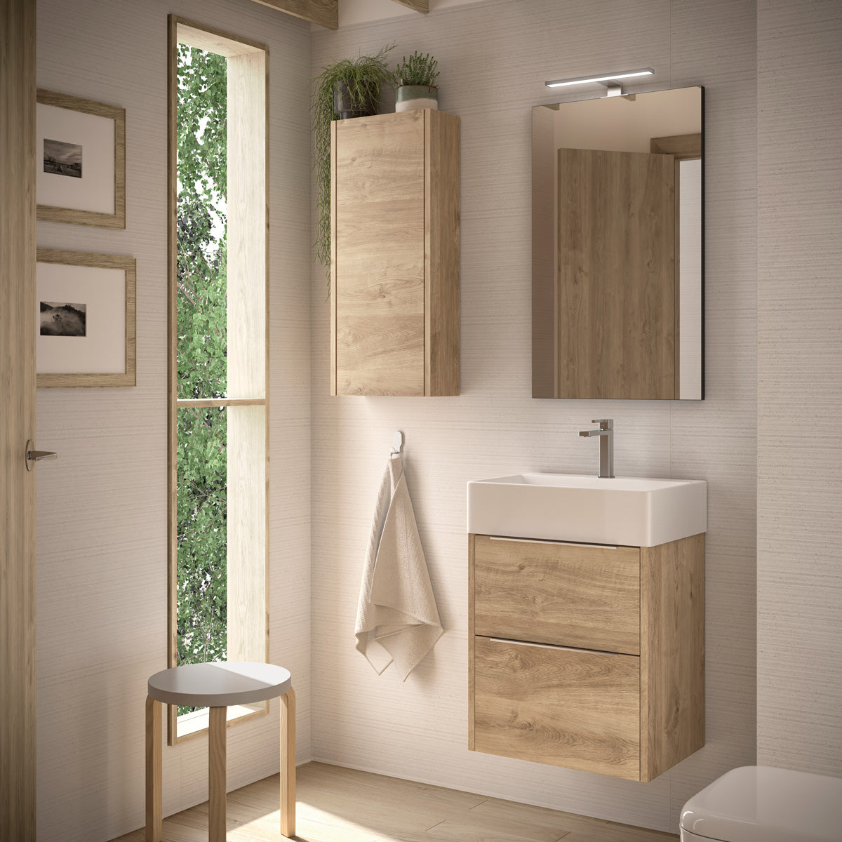 Stilrent møbelpakke i varm egetræsfinish til små badeværelser