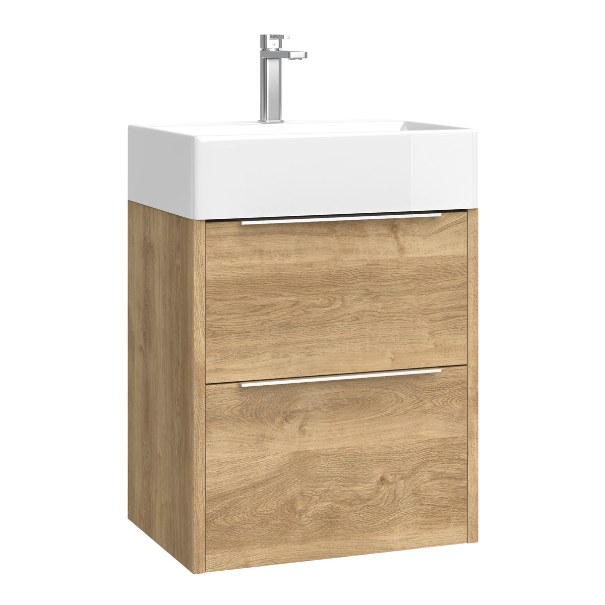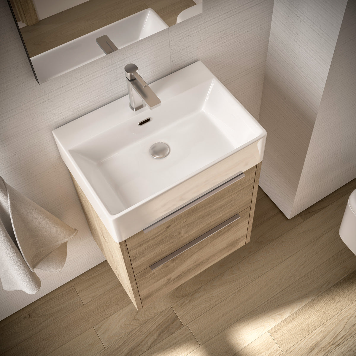 Tenfors Smidig 50 cm Eg er en komplet møbelpakke til badeværelset, hvor både design og funktion spiller en central rolle. Sættet består af en håndvask i porcelæn og en væghængt Kommode i en varm og naturtro egetræsfinish – perfekt til gæstetoilettet, det lille badeværelse eller projekter med begrænset plads.
