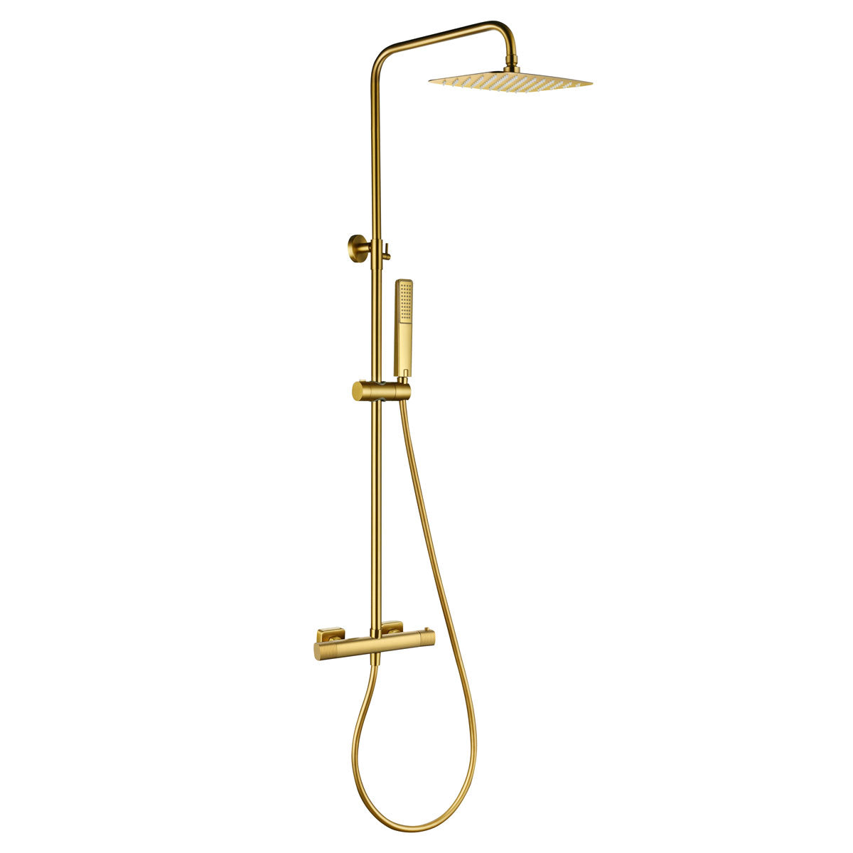 Firenze Børstet Guld 200 x 300 mm er udstyret med termostatarmatur, hvilket giver en stabil og sikker temperatur under badet. Armaturet har integreret omskifter, så du nemt kan skifte mellem hovedbruser og håndbruser. Den store hovedbruser giver en behagelig bruseoplevelse med en gennemsnitlig vandgennemstrømning på 12 l/min, mens håndbruseren fungerer som et praktisk supplement til fleksibel brug. Kombinationen af hovedbruser og håndbruser gør brusesættet til et funktionelt valg til både afslapning og hverdag.