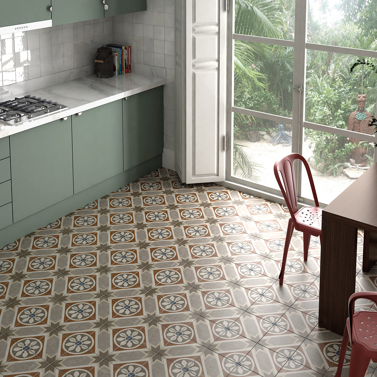 Art Belle Color Mat 20x20 er en livlig og farverig klinke, der kombinerer geometrisk præcision med en blødt patineret overflade. Det legende mønster i beige, grå, hvid og med indslag af blå skaber en varm vintagefornemmelse, der leder tankerne hen på middelhavsklinker eller historiske cafégulve. Den matte overflade fremhæver den tidstypiske karakter og er perfekt til at skabe en personlig og indbydende stemning i alt fra køkken og entré til badeværelse eller orangeri.