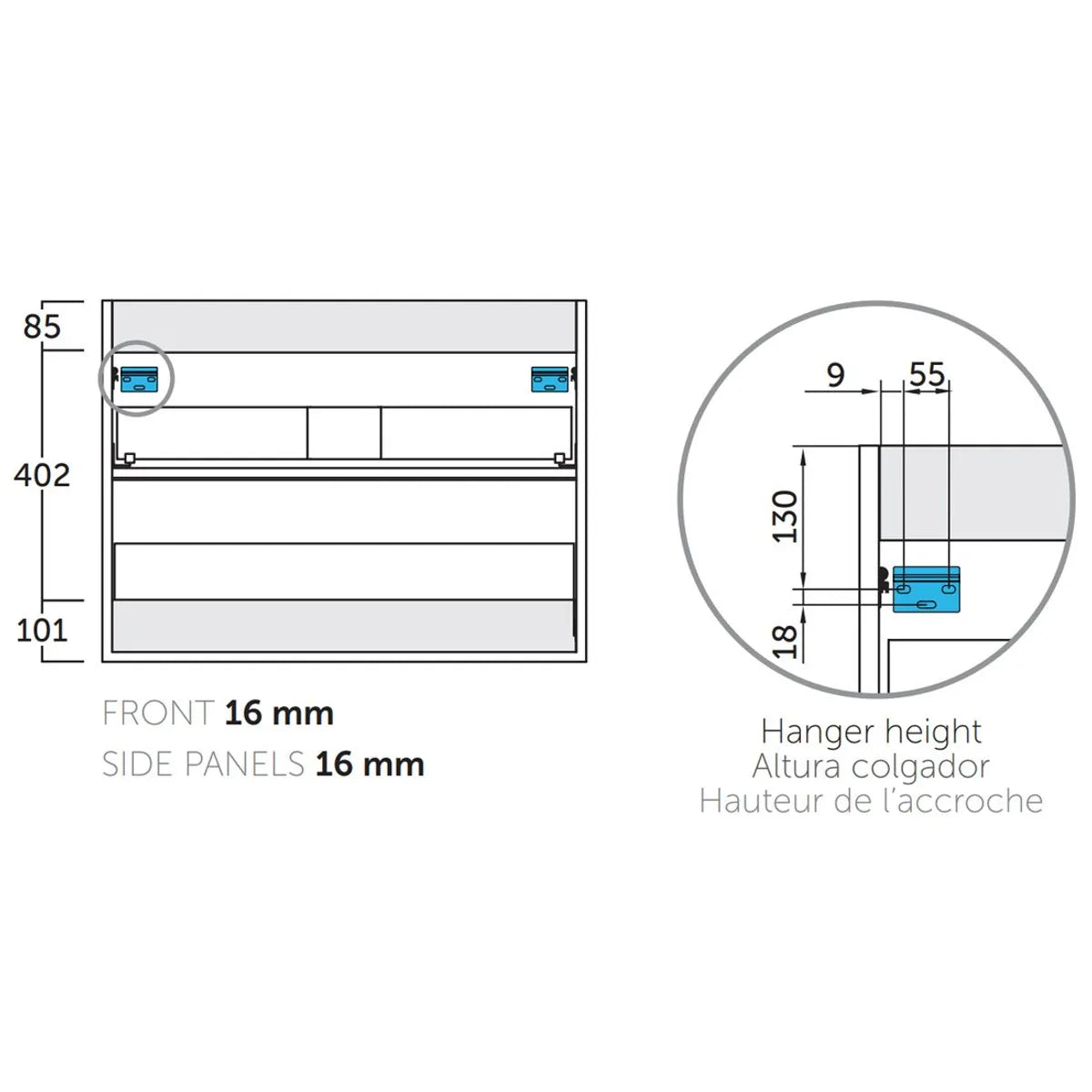 Kommoderne i serien fås i to bredder, 60 cm og 80 cm, hvilket giver fleksibilitet til forskellige badeværelsesstørrelser. Med en dybde på 46 cm og en højde på 59 cm tilbyder de rigelig opbevaringsplads uden at dominere rummet. De er udstyret med to rummelige skuffer med soft-close mekanismer, hvilket gør dem både praktiske og støjsvage. Skuffernes grebskanter, fremstillet i samme materiale og finish som resten af møblet, bidrager til et ensartet og moderne udseende.