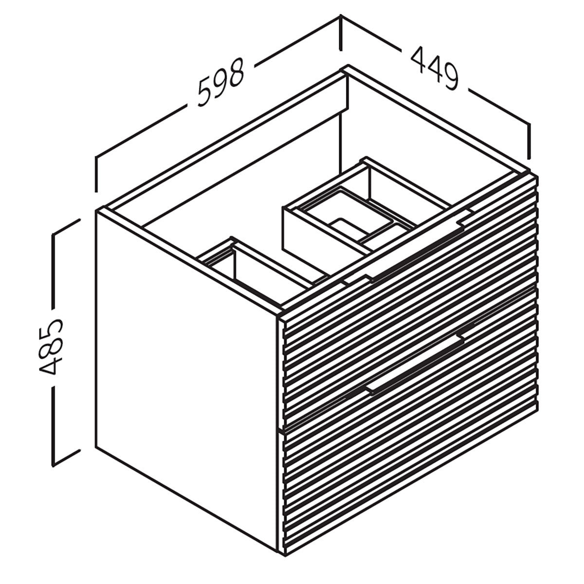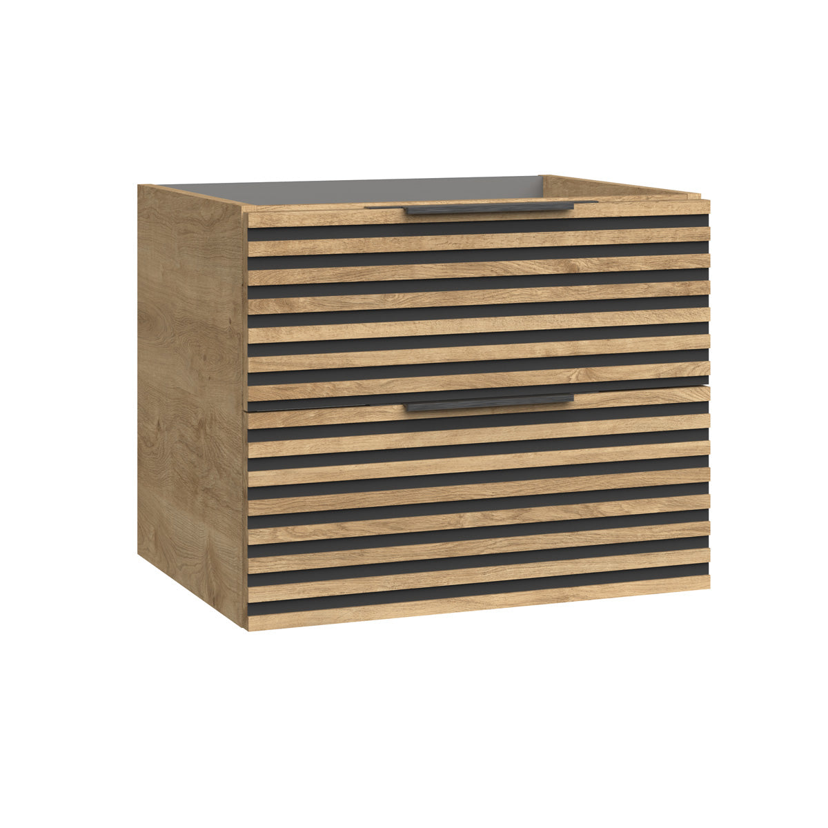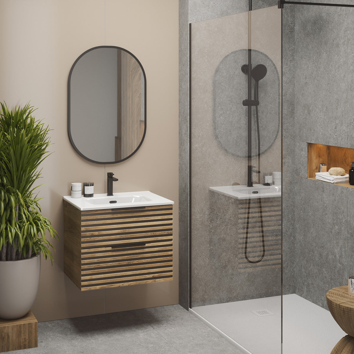 Tenfors Stilja i 60 cm er en moderne badeværelseskommode/vaskeskab i en naturligt lys egetone. Fronten har en markant lamelstruktur: sort MDF-base med horisontale egelameller, som skaber et levende og harmonisk udtryk. To fuldt udtrækkelige skuffer med GRASS-skinner og metalsider giver en blød, lydsvag og kontrolleret lukning, mens praktiske smårum i den øverste skuffe hjælper dig med at holde orden på småting. Den skjulte ophængning kan justeres i højde og dybde, og det sikre ophængningssystem gør monteringen enkel og stabil. Sorte metalgreb bryder med egenes naturlige tone og fremhæver det moderne design.