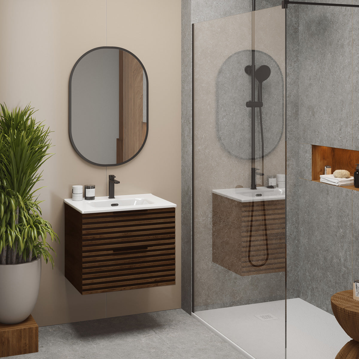 Tenfors Stilja i 60 cm er en stilren badeværelseskommode/vaskeskab i en varm valnøddetone. Fronten har en markant lamelstruktur: sort MDF-base med horisontale valnøddelameller, som giver møblet dybde og rytme. To fuldt udtrækkelige skuffer med GRASS-skinner og metalsider giver en blød, lydsvag og kontrolleret lukning, mens praktiske smårum i den øverste skuffe holder styr på hverdagens småting. Den skjulte ophængning kan justeres i højde og dybde, og det sikre ophængningssystem gør monteringen enkel og stabil. Sorte metalgreb fuldender det elegante formsprog.