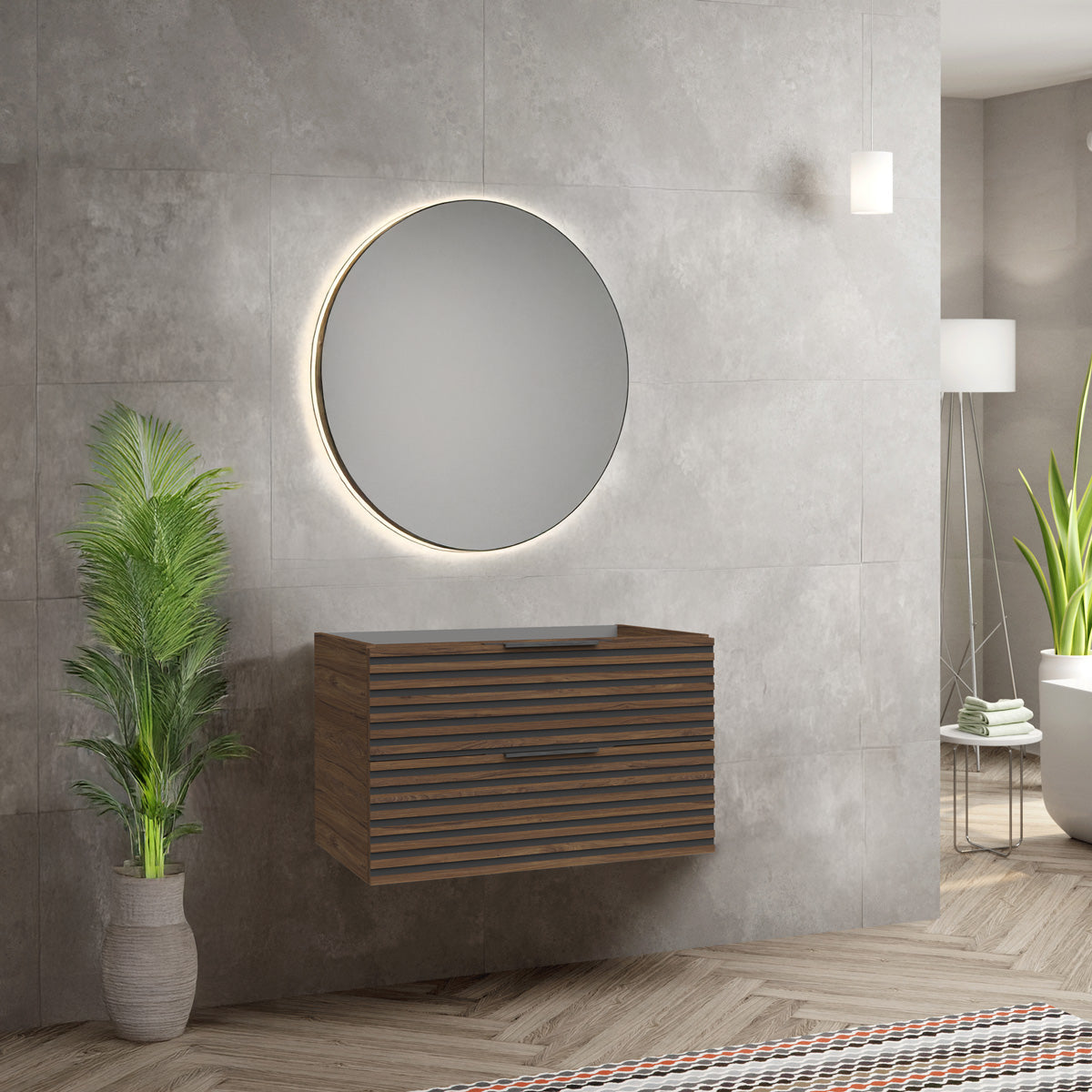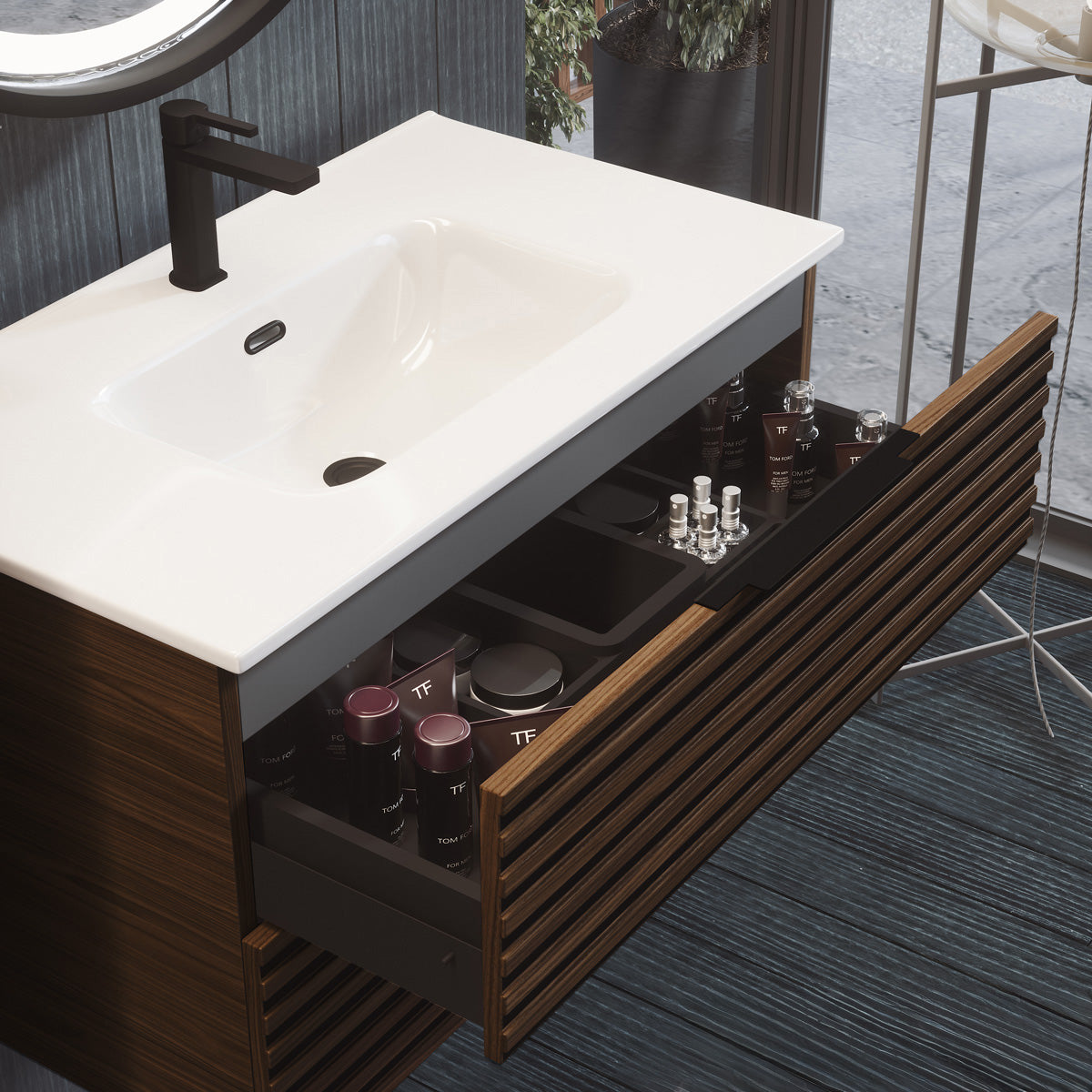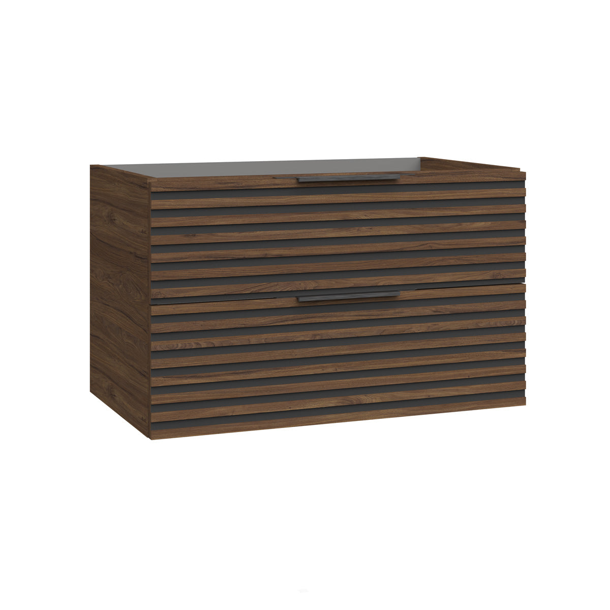Tenfors Stilja i 80 cm er en stilren badeværelseskommode/vaskeskab i en varm valnøddetone. Fronten har en markant lamelstruktur: sort MDF-base med horisontale valnøddelameller, som giver møblet dybde og rytme. To fuldt udtrækkelige skuffer med GRASS-skinner og metalsider giver en blød, lydsvag og kontrolleret lukning, mens praktiske smårum i den øverste skuffe holder styr på hverdagens småting. Den skjulte ophængning kan justeres i højde og dybde, og det sikre ophængningssystem gør monteringen enkel og stabil. Sorte metalgreb fuldender det elegante formsprog.