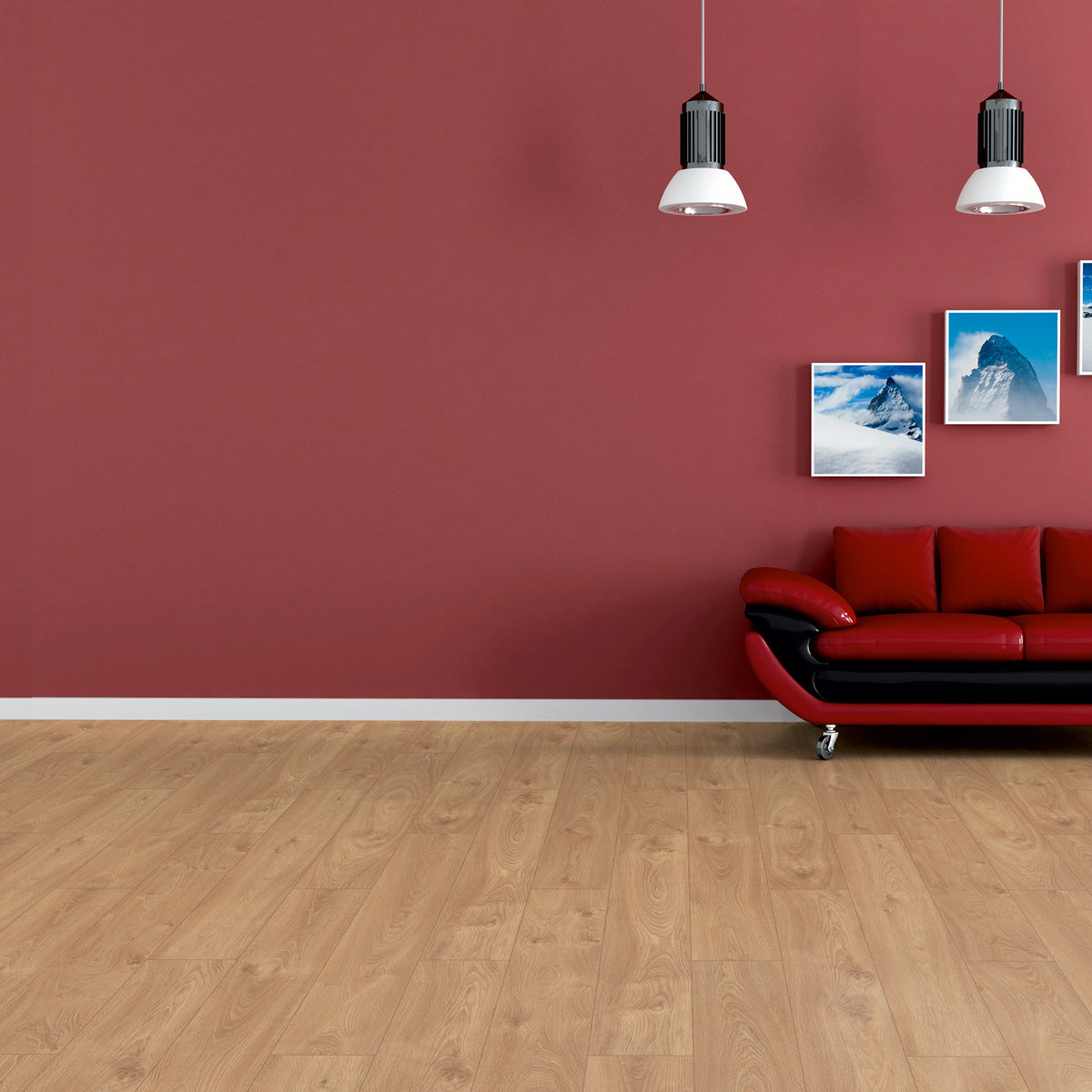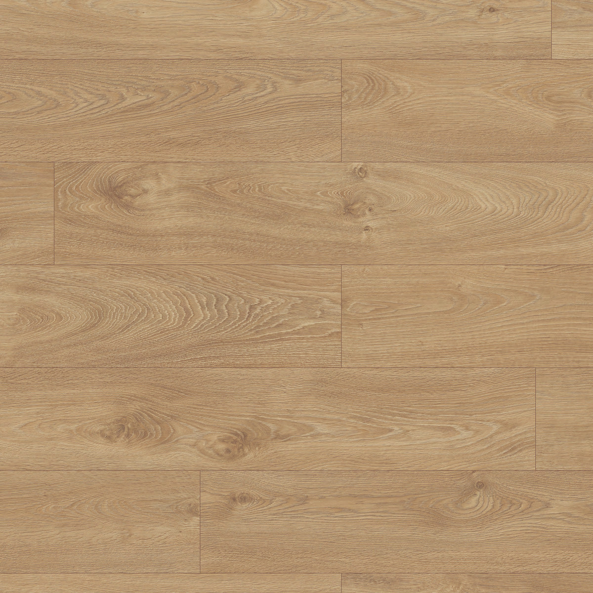 Laminatgulv Oak Zermatt 10 mm er et varmt og indbydende gulv i en naturlig egetone med livlig åretegning og en mat overflade, der minder om olieret eg. Med det brede format på 184,5x24,4 cm skabes et elegant og harmonisk udtryk, som giver rummet en eksklusiv fornemmelse. Den avancerede Embossed-in-Register-teknologi giver overfladen en autentisk struktur, hvor træets mønster og porer følger den visuelle dekoration – hvilket gør, at gulvet både føles og ser ud som ægte træ.