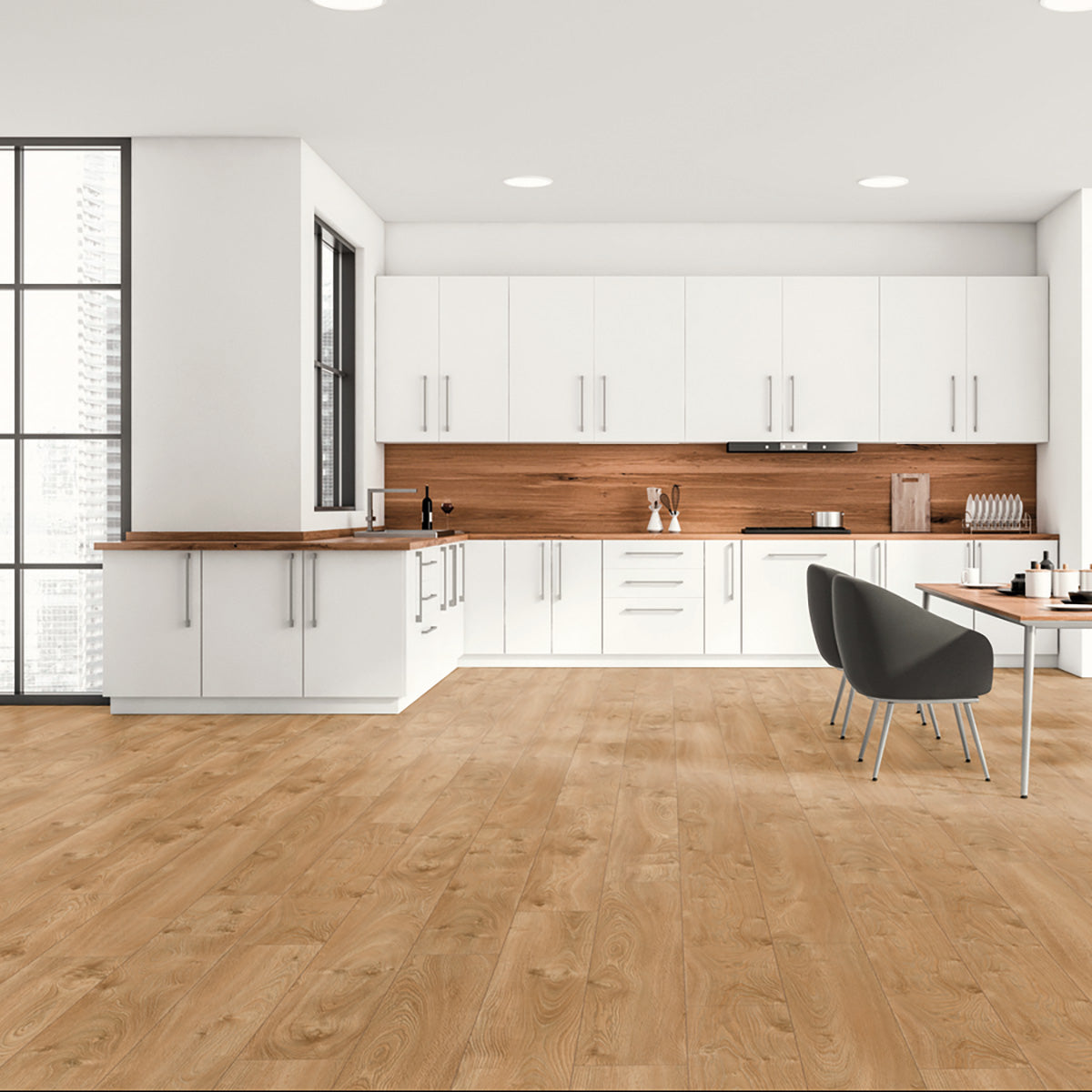 Laminatgulve er et fremragende valg for dig, der ønsker at kombinere æstetik med funktion. De tilbyder en smuk og naturtro træfornemmelse, samtidig med at de er yderst modstandsdygtige over for ridser, trykmærker og solblegning. Laminat kræver ingen efterbehandling og er meget let at rengøre – det er nok med tørmopning eller en let fugtig klud.