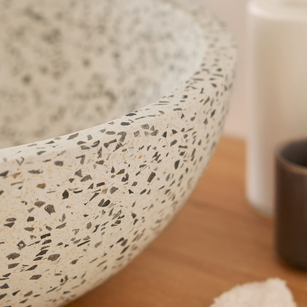 - Materiale: Ægte terrazzo – hvid cement blandet med grå og sorte marmorskærver