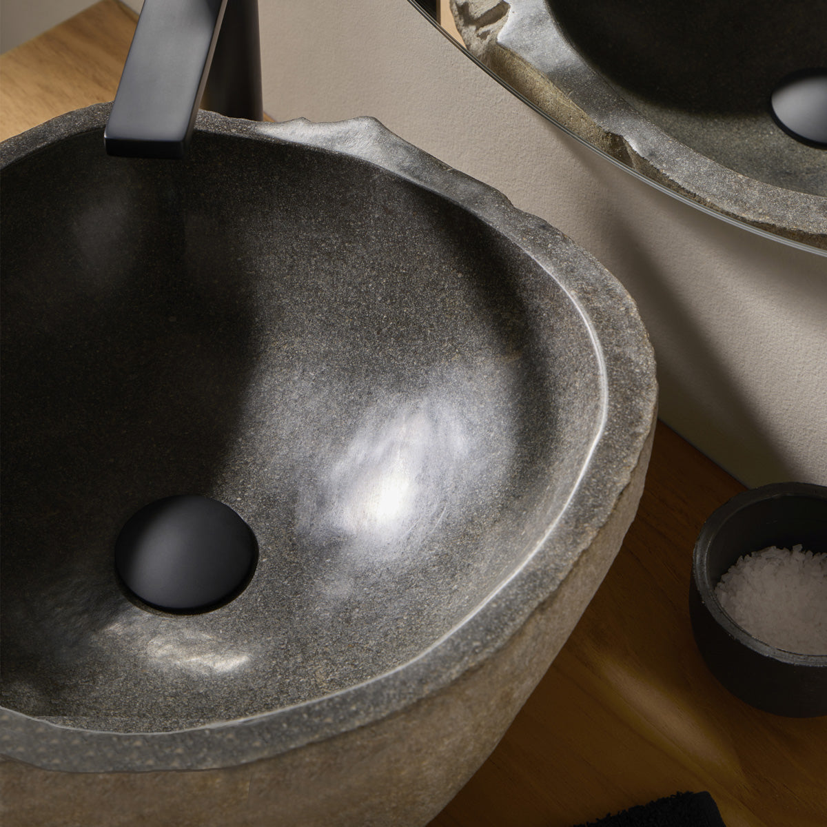 Da Håndvask Søsten er fremstillet af naturlig flodsten, varierer hver håndvask i form, farve og struktur. Det giver et levende og autentisk udtryk, hvor ingen modeller er helt ens. De organiske former og stenens naturlige variationer gør hver håndvask til et unikt blikfang i badeværelset.