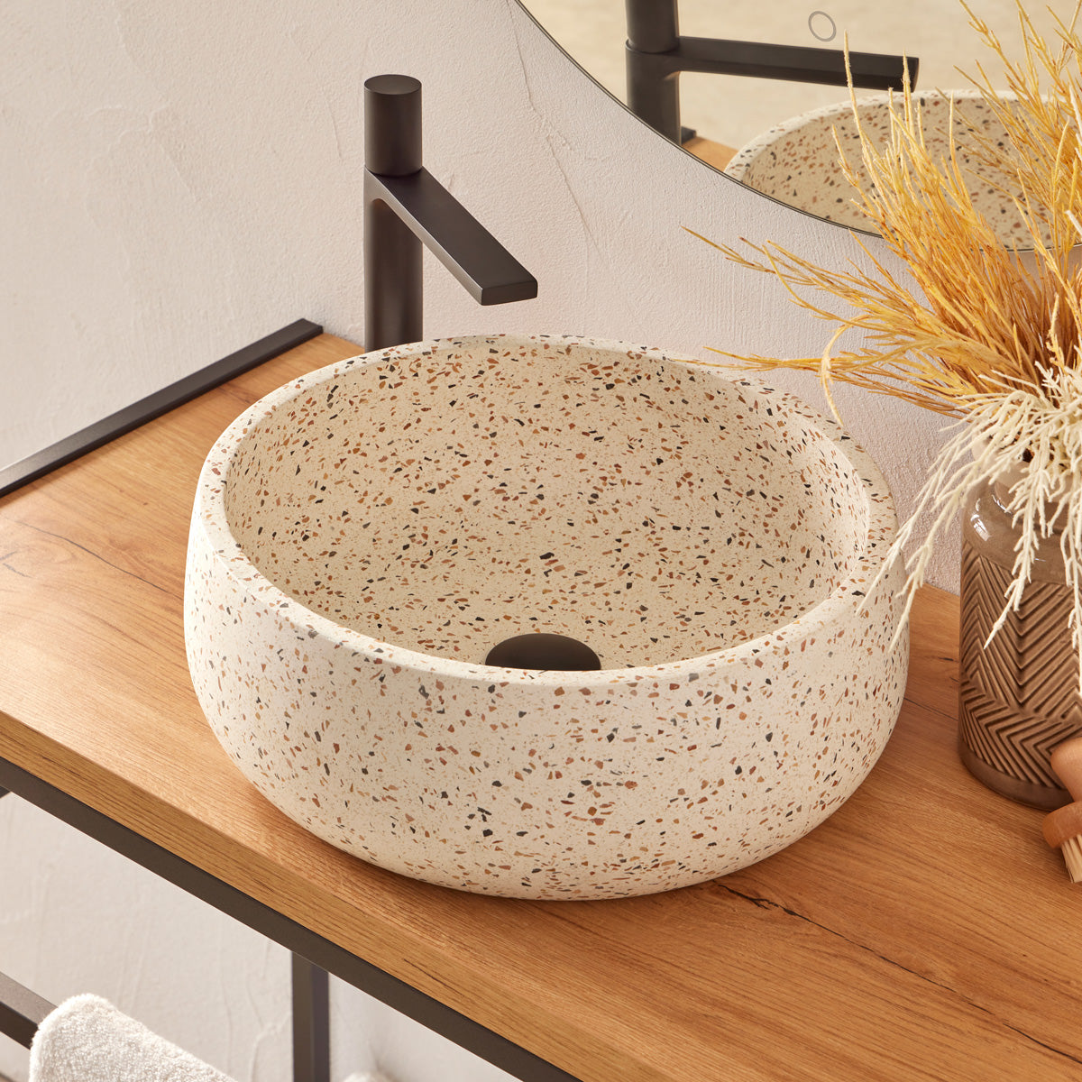 Håndvask Terrazzo Mix er en elegant og karakterfuld håndvask fremstillet af ægte terrazzo – en eksklusiv blanding af hvid cement og marmorskærver i naturlige farvetoner. De små stenfragmenter i grå, beige, brun og terrakotta danner et levende mønster med subtile kontraster, der giver badeværelset en unik og varm karakter. Den polerede overflade, både indvendigt og udvendigt, giver en blød og behagelig fornemmelse med en stilfuld glans.