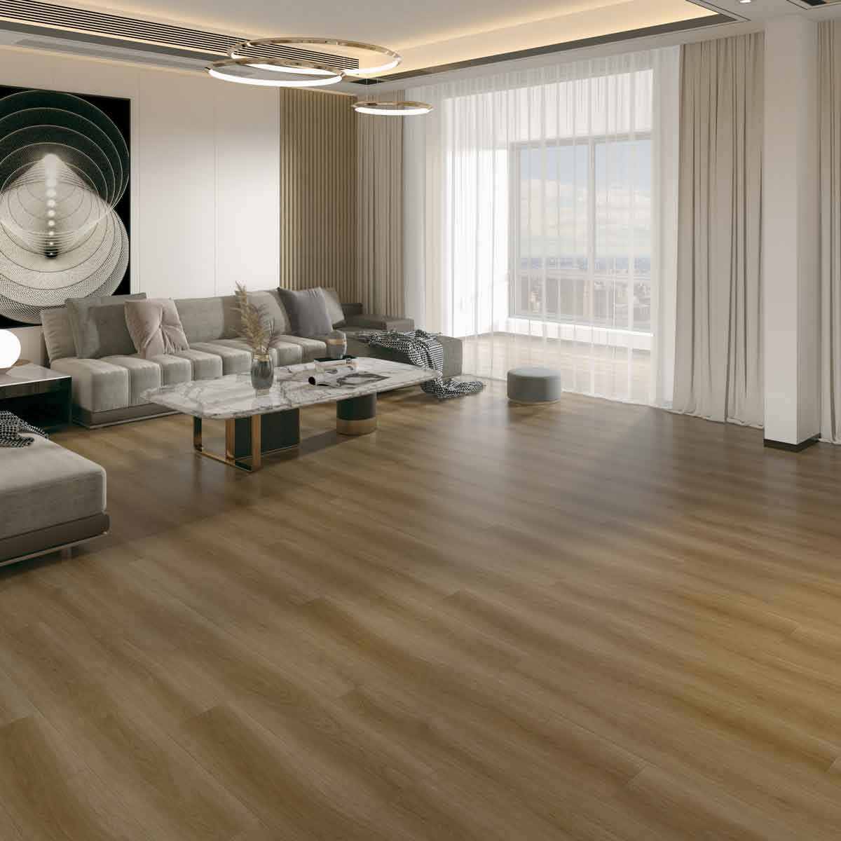 Vinylgulv SPC Betulla Roble er et 1-stavs gulv i en varm, naturlig egetone med bløde men tydelige årer, som giver rummet en levende og hyggelig karakter. Den gyldenbrune nuance skaber en harmonisk balance mellem klassisk og moderne og passer lige godt i stilrene miljøer som i mere traditionelle hjem.